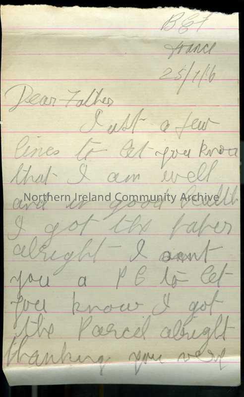 Handwritten letter from James to his father. Sent postcard to say he had received parcel