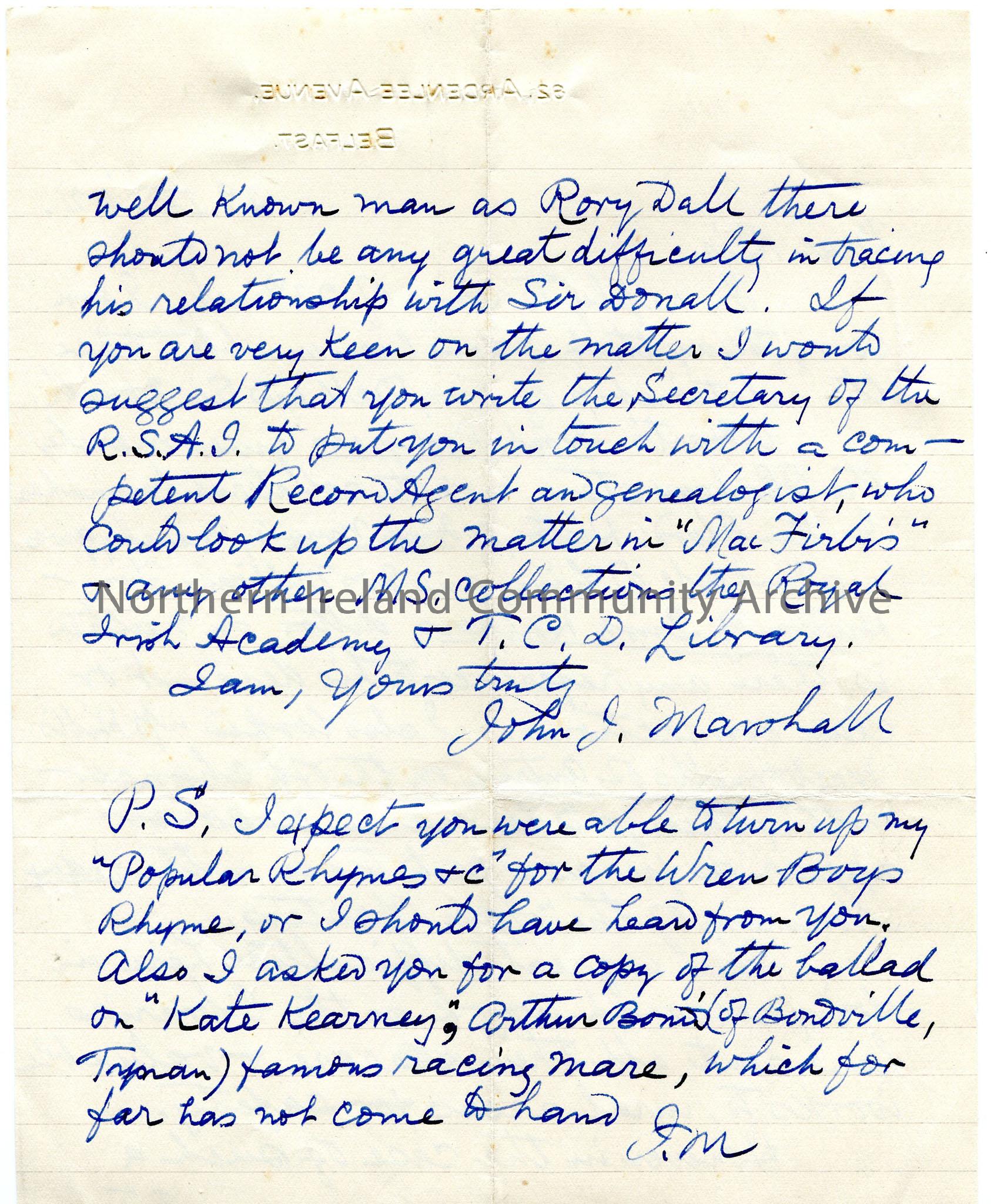 Handwritten letter from John Marshall re background history for Rory Dall and any clan connection. Also song exchange. – img376