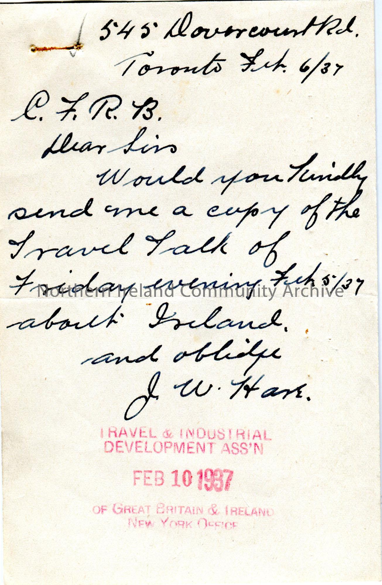 Handwritten letter from J.W. Hare asking for a copy of a travel talk about Ireland broadcast on 5th May 1937.
