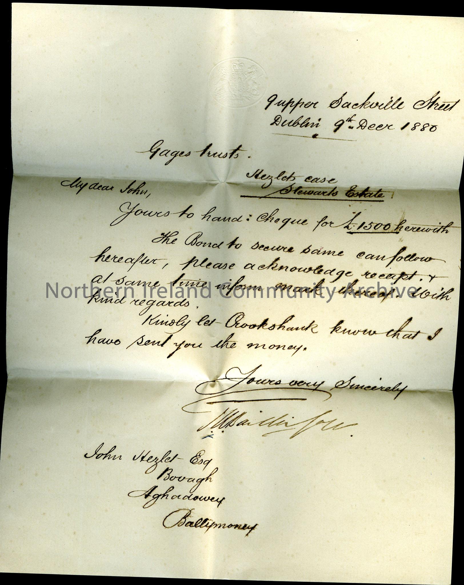 Handwritten letter from 'Maillingage?' ('9 Upper Sackville St. Dublin') to 'John Hezlet Esq, Bovagh, Aghadowey, Ballymoney'. Letter is re. the 'Gage's Trust, Hezlets case, Stewarts Estate'. In letter sender refers to an enclosed cheque for £1500 and a bond for the same. Asks for acknowledgement of receipt and for Hezlet to inform Crookshank that he has received the money.