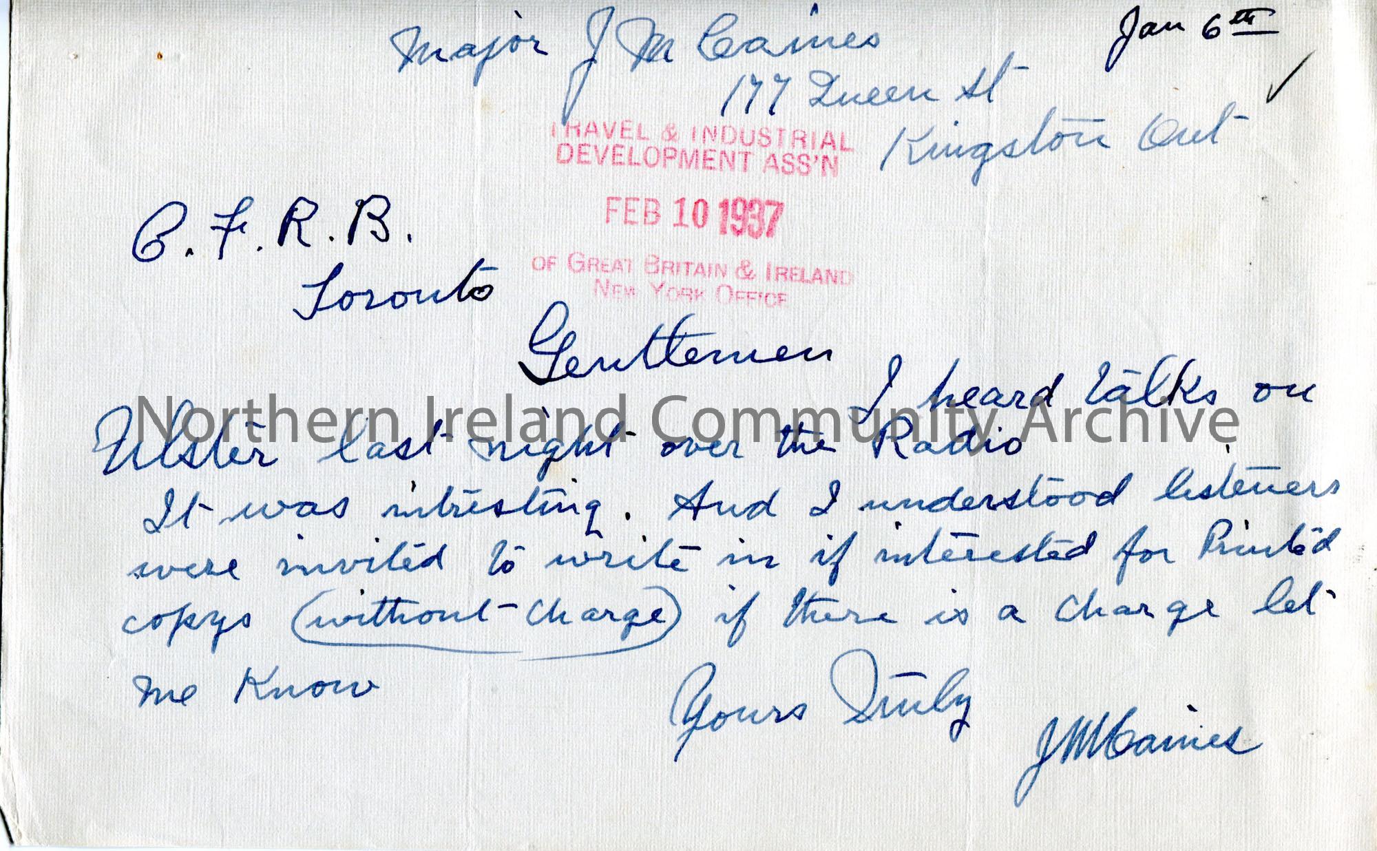 Handwritten letter from Major J M Caines to C.F.R.B. radio station asking for a copy of talks on Ulster which was broadcast the previous evening.