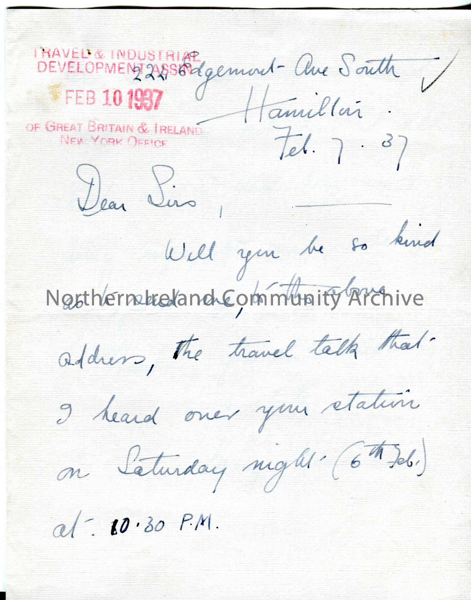 Handwritten letter from Mary Hannover asking for a copy of the Travel Talk on Ireland broadcast on C.F.R.B. on 6th February 1937 at 10.30pm.