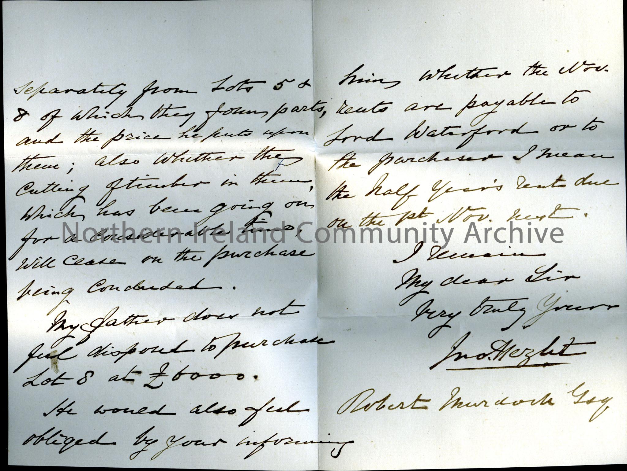 Handwritten letter from Mr. Hezlet to 'Robert Murdoch Esq' re. 'the Waterford Estate'. Hezlet states that his father has instructed him to confirm his purchase of two lots put on sale by the 'Marquis of Waterford'. Also, expresses interest for Lot 4 (see CM:2017:486) if the current bidder withdraws and asks for clarification on some points of purchase.