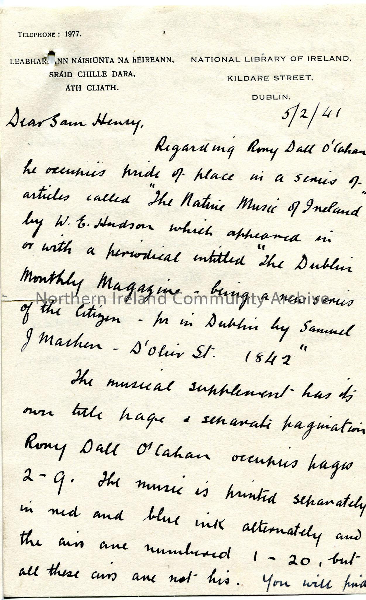 Handwritten letter from National Library of Ireland with Rory Dall O’Cahan reference sources