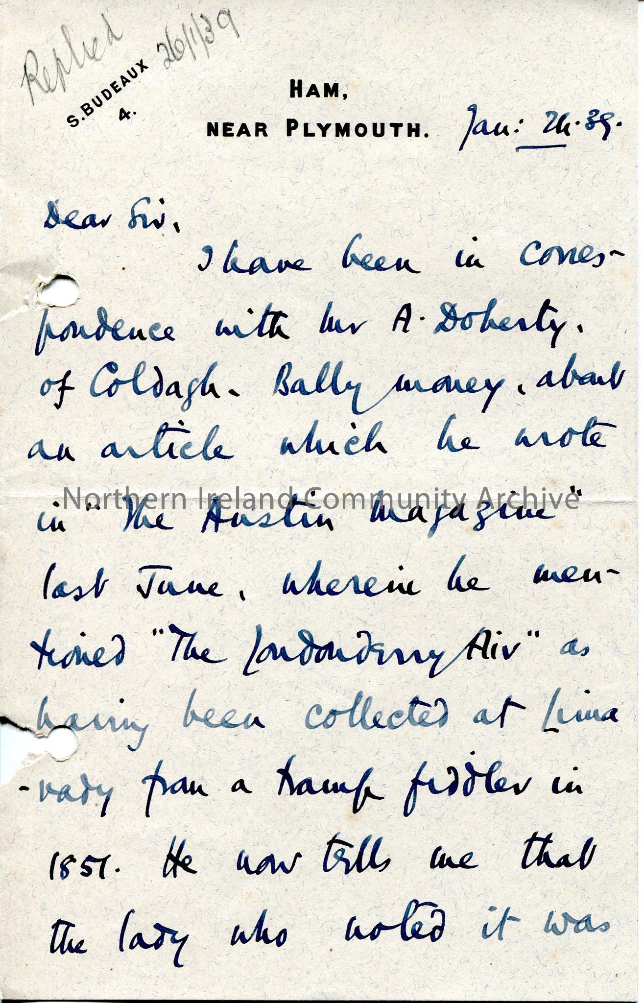 Handwritten letter from nephew of Miss Ross, re Londonderry Air and McCormick and asking for any information Sam may have