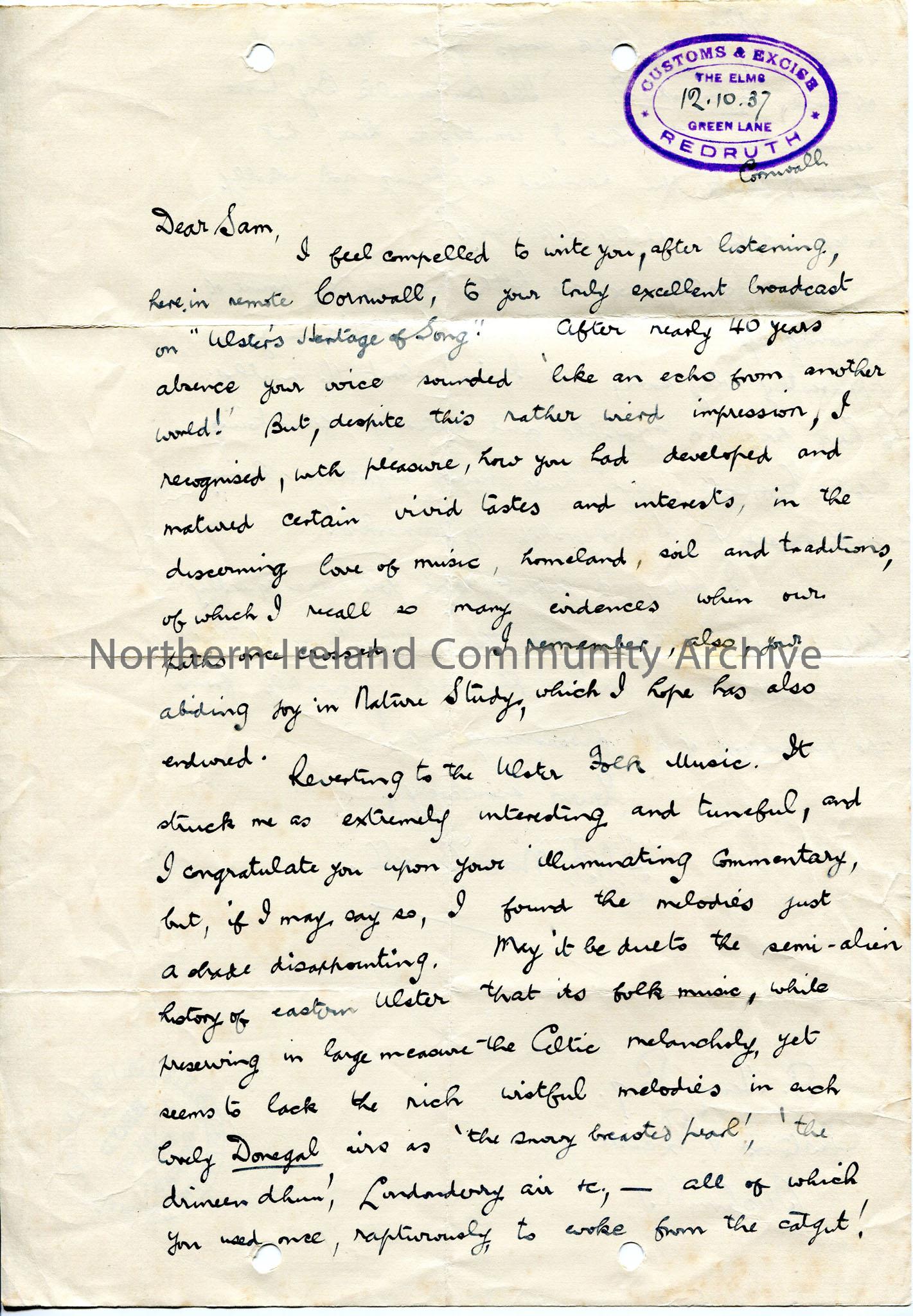 Handwritten letter from past acquaintance of Sam's from Customs and Excise, commenting on broadcast of 'Ulster's Heritage of Song' and adding information on songs used. Stamped as received by BBC.