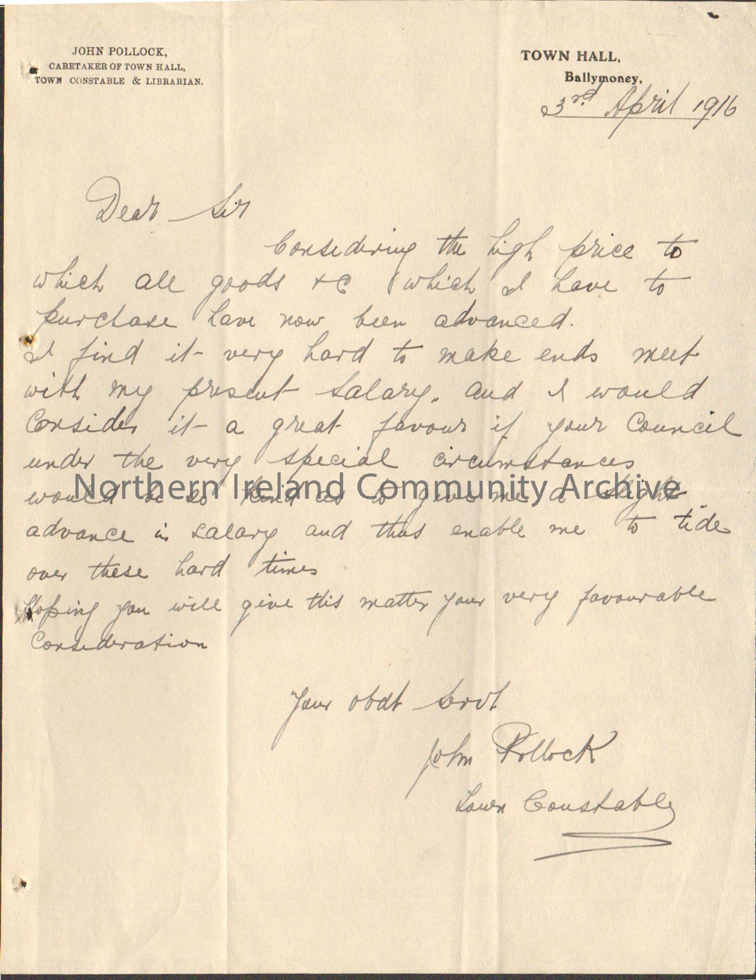 Handwritten letter from Town Constable, John Pollock requesting a pay rise.