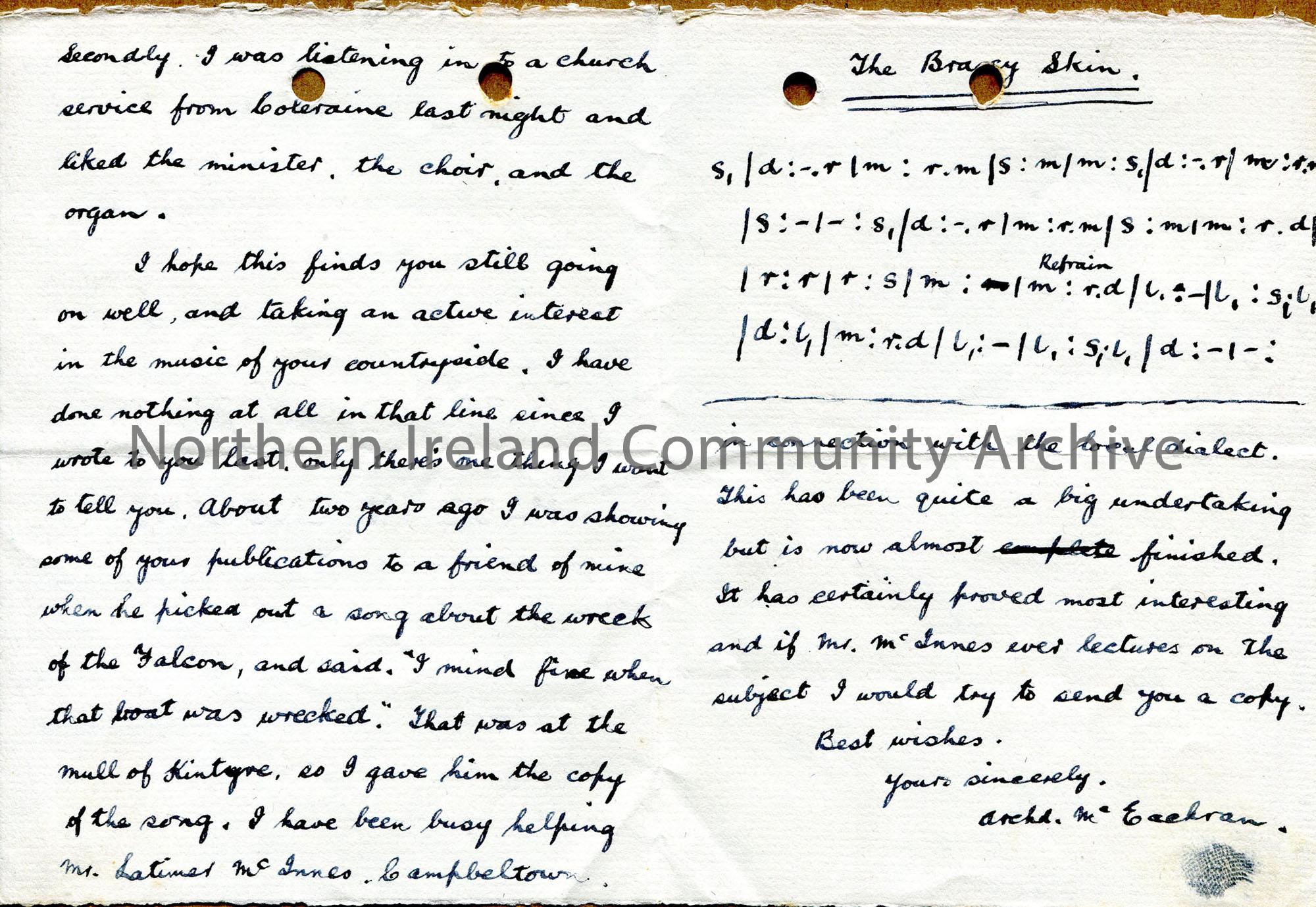 Handwritten letter - gives tonic sol-fa to 'The Braxy Skin', updates Sam on work he has been doing on local dialect in Kintyre, listened to church broadcast from Coleraine.