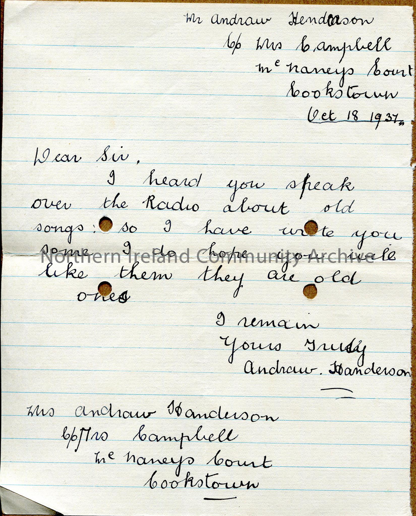 Handwritten letter - heard radio broadcast, sending old songs (not present with letter)
