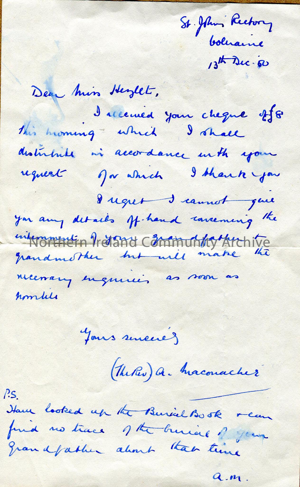 Handwritten letter in ink from Rev A [Alwyn] Maconachie [Church of Ireland minister in Killowen], thanking Miss Hezlet for £8 cheque, which he will distribute as requested, but unable to help with enquiries about grandparents in Burial Book