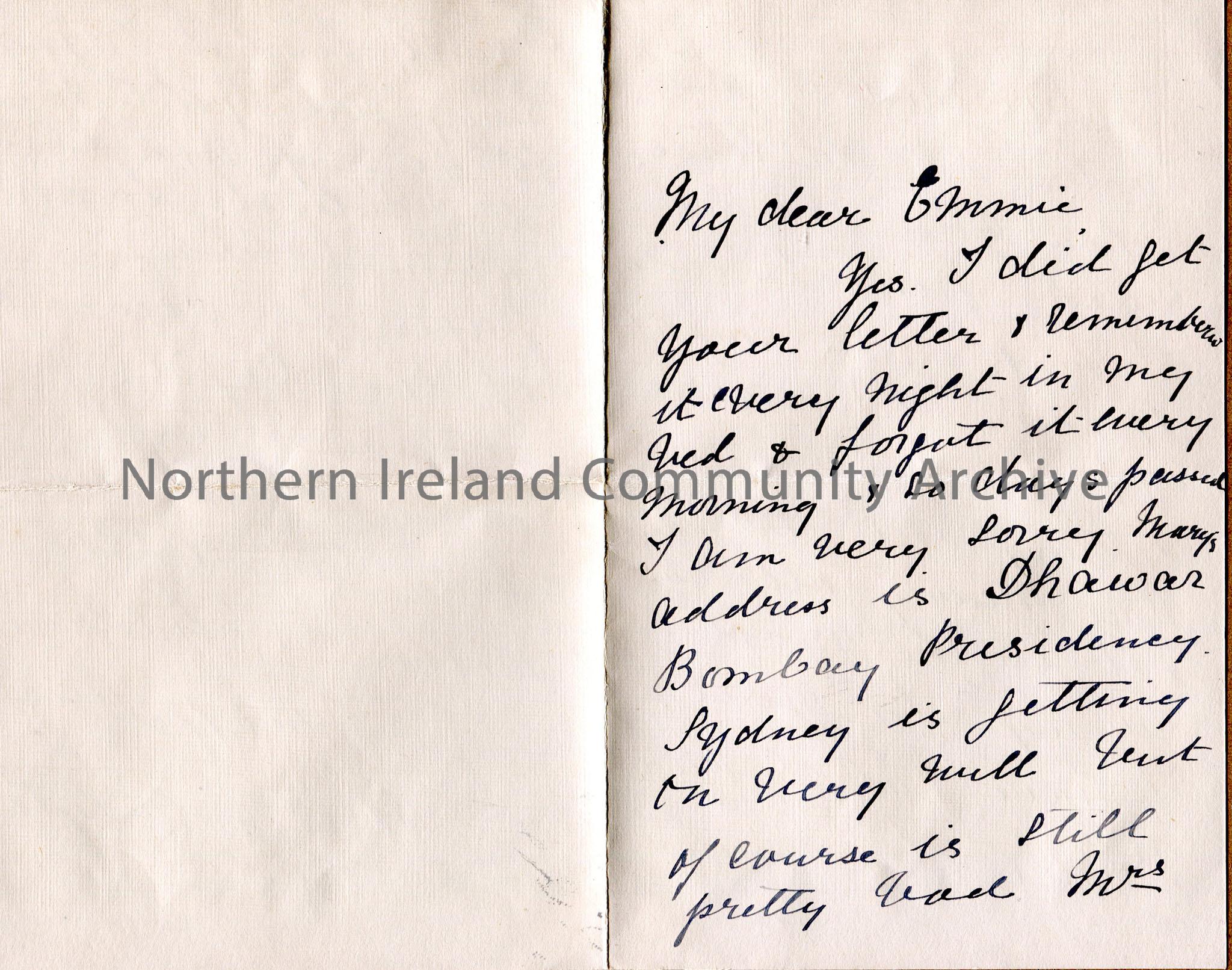 Handwritten letter, in ink, to Emmie from ?Hariette Lyle. Health of various people. Got badge for Emmie, who is in Ballycastle – £5 fee for losin…