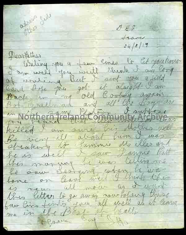 Handwritten letter in pencil from James to his father. Back in old company. Alex Anderson killed. Mentions Bob Creelman, Sammie Millar, Dannie Platt.