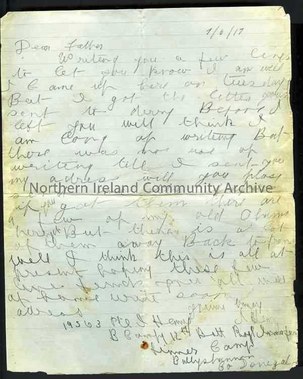 Handwritten letter in pencil from James to his father. Now at Finner Camp. Few old friends around but others gone back to France