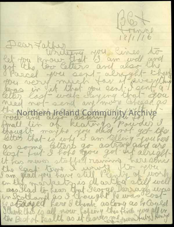 Handwritten letter in pencil from James to his father. Requesting flea powder but no more cheese as army rations include that. Mentions George Darrell…
