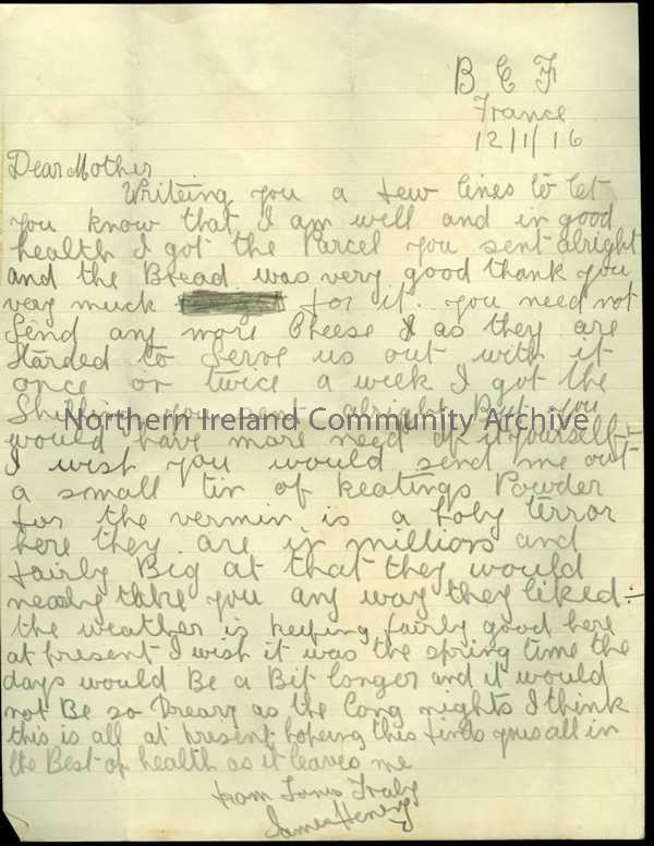 Handwritten letter in pencil from James to his mother. Received bread and shilling. Does not need cheese as army provides but would like Keatings Powder for fleas - vermin "in millions and fairly big"