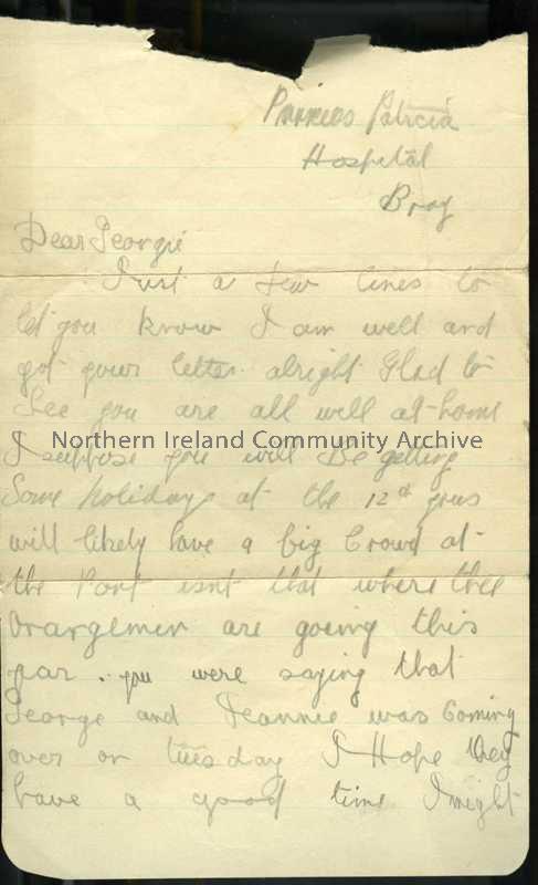 Handwritten letter in pencil from James to his sister Georgina [referred to as Georgie] from convalescent hospital in Bray. The Twelfth is in Portrush - there will be a big crowd for the Orangemen. George and Jeannie are coming over to Coleraine. Mentions brothers William and Sandy. Would like a pound for the 12th but will not get drunk.