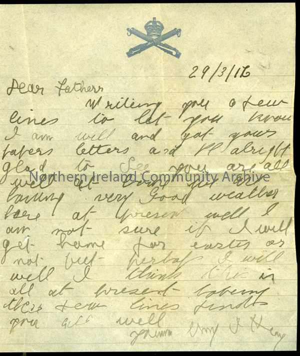 Handwritten letter in pencil on notepaper stamped at top with crown and crossed ? Vickers guns (Machine Gun Battalion emblem). Does not think will get home on leave for Easter
