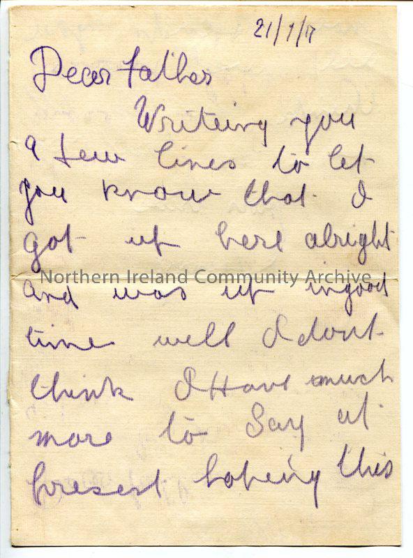 Handwritten letter in purple pencil from James to his father – “got here alright” [Finner Camp]