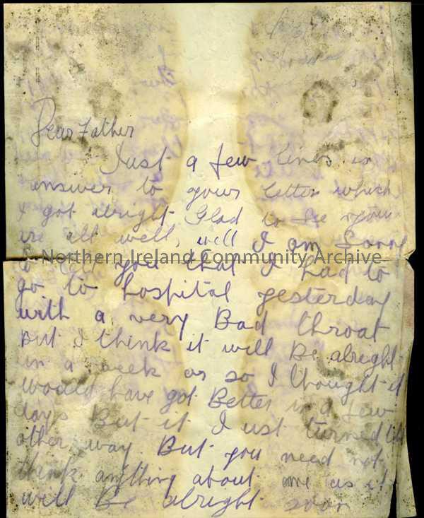 Handwritten letter in purple pencil, from James to his father. Has sore throat just as hoped to go on leave.