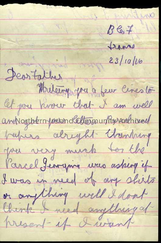 Handwritten letter in purple pencil from James to his father. Mentions Georgina and John Young