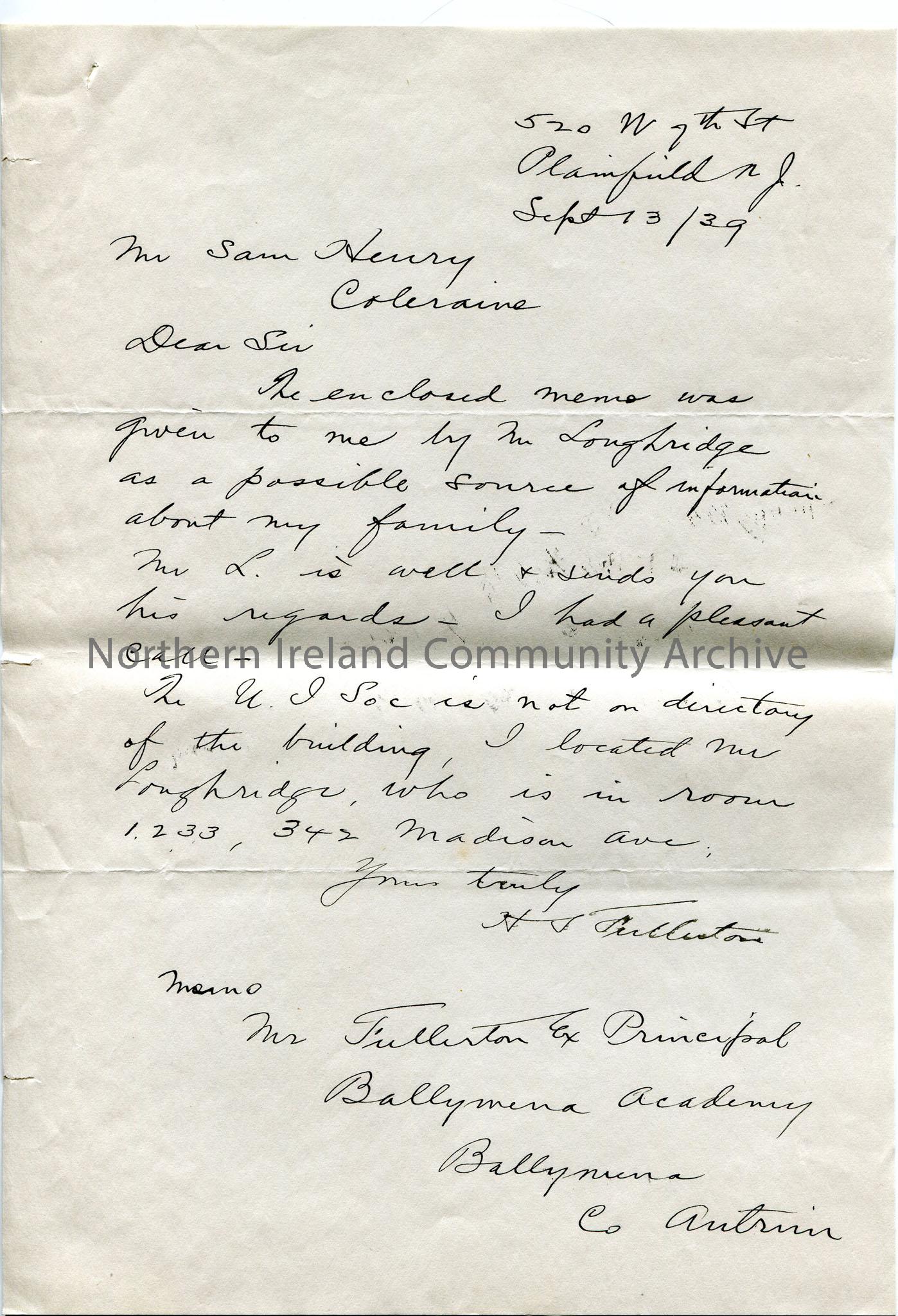 Handwritten letter. Mentions memo by Mr Loughridge of Madison Avenue [Sam had corresponded with him in relation to Chester Arthur entry for Ulster-Iri…