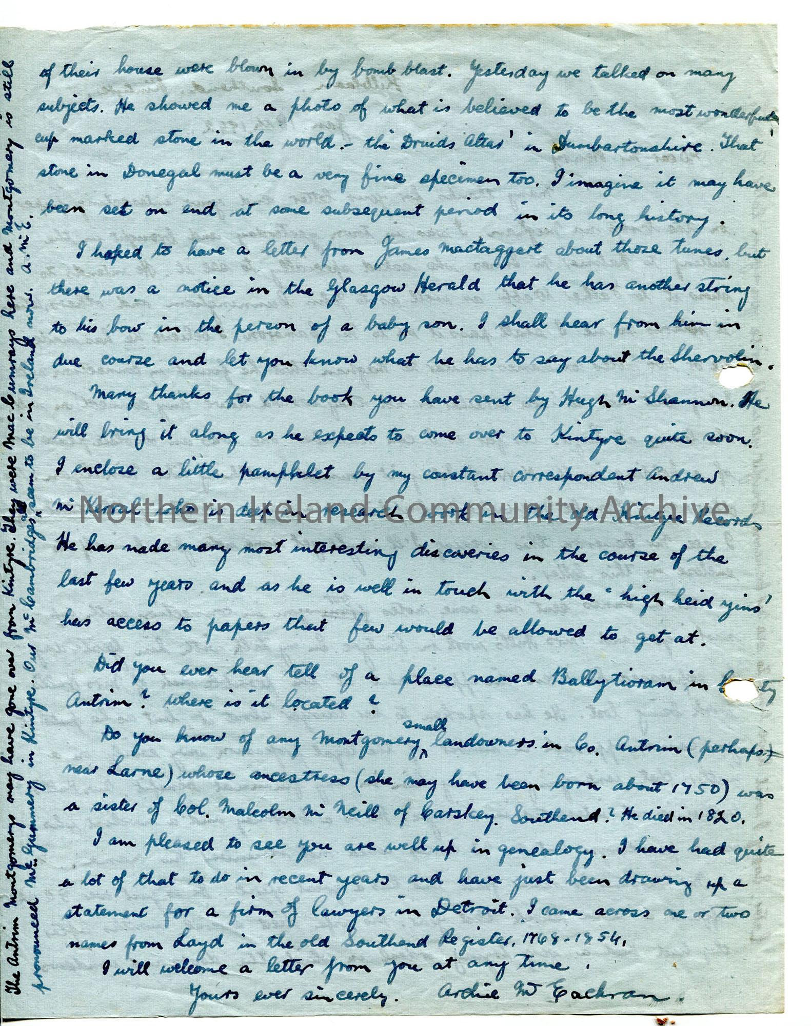 Handwritten letter - more discussion on placenames similar in Northern Ireland and Scotland/Kintyre and marked stones in Dunbartonshire and Donegal. Also requests information on Montgomery family, related to family line of McNeills in Kintyre. Mentions, like Sam, he is also doing genealogical research - at present for lawyers in Detroit - and found names from Layd area (Co. Antrim) in Southend (Kintyre) register 1768-1854.