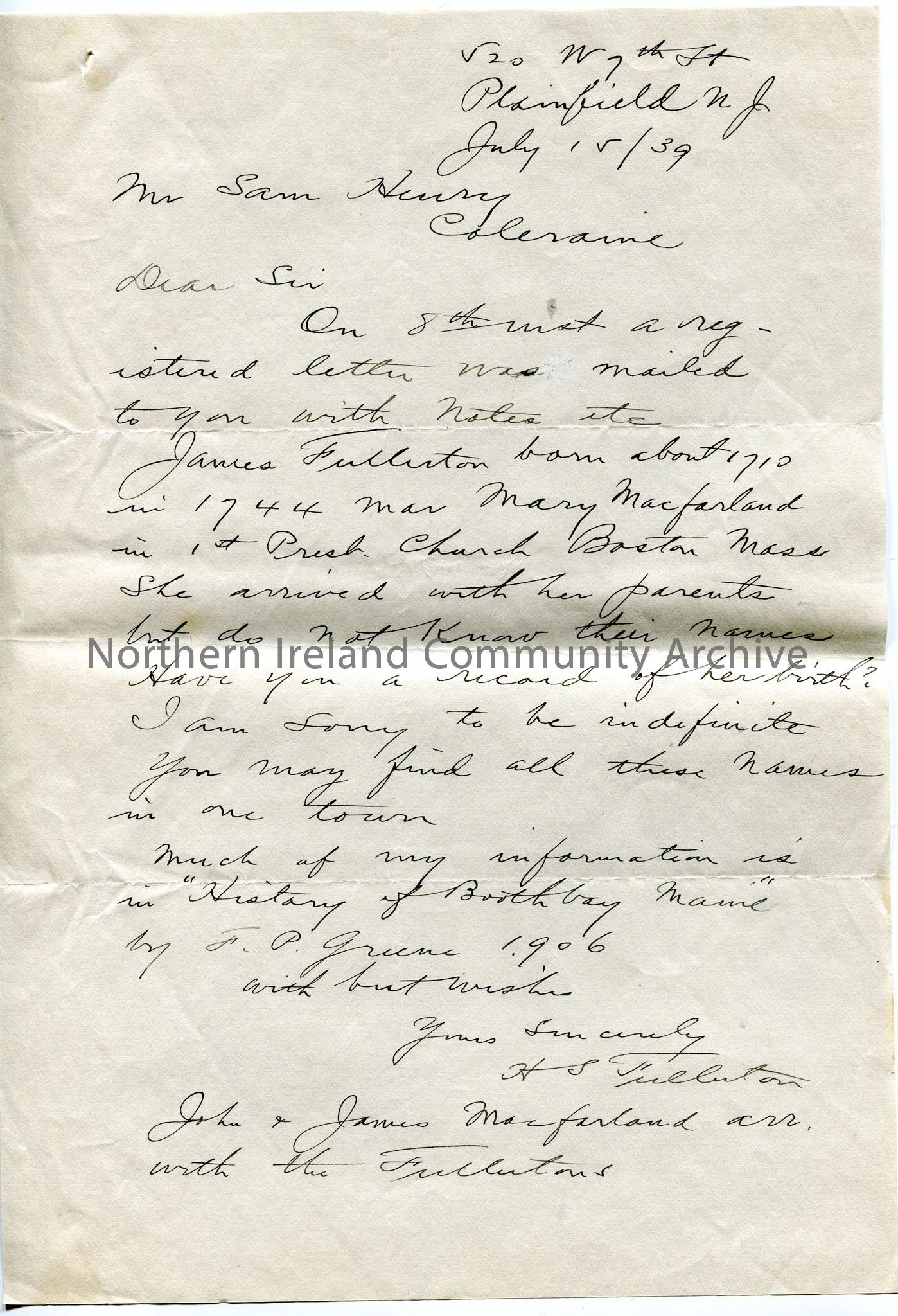 Handwritten letter. More requests and information re Fullertons, including marriage to MacFarland in Boston Mass.