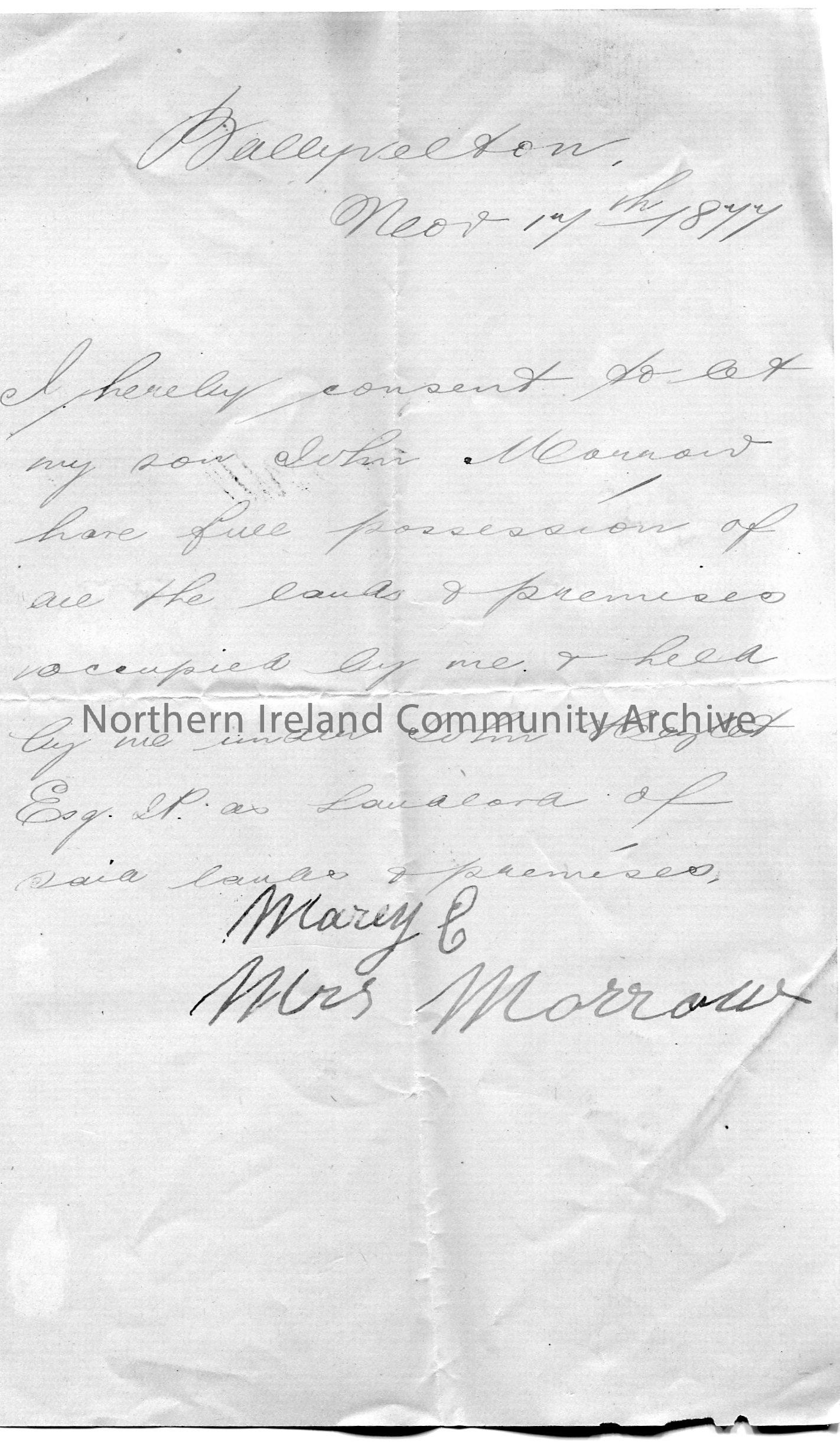 Handwritten letter. No recipient name given. Giving consent for the transfer of owvership of land and premises to her son, Mr John Morrow. Mentions John Hezlet as landlord of said land and premises.