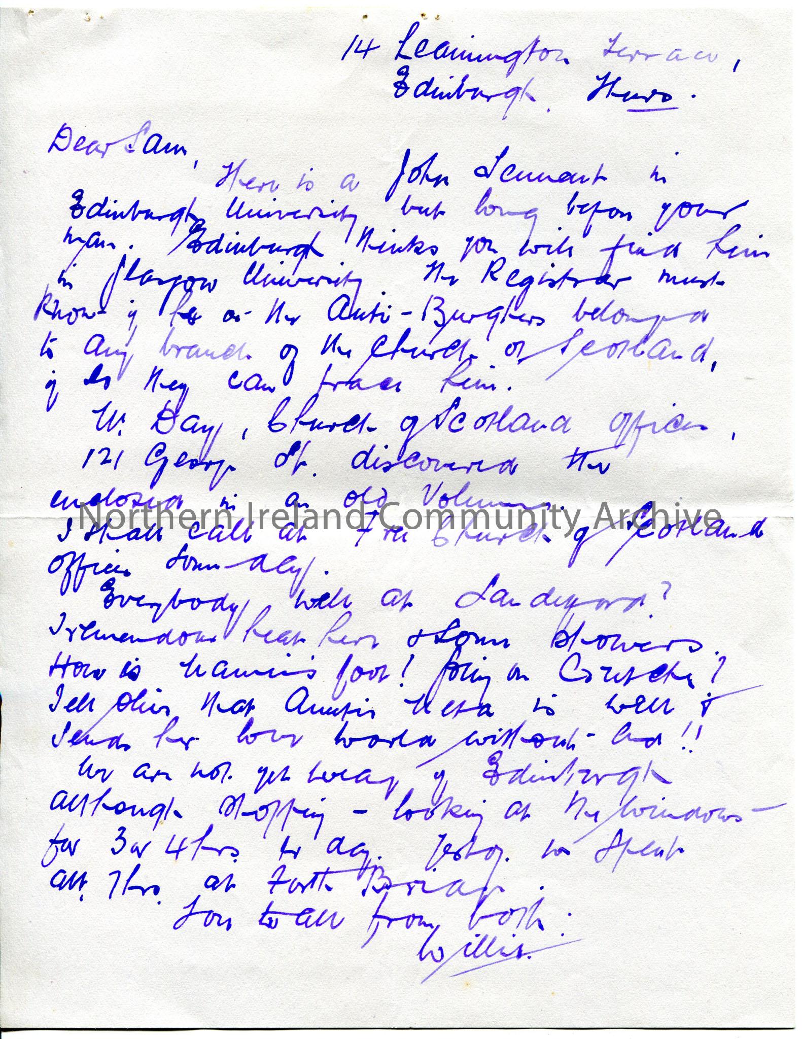 Handwritten letter – no Tennant in Edinburgh University – may be Glasgow – may be traced through anti-Burgher churches.