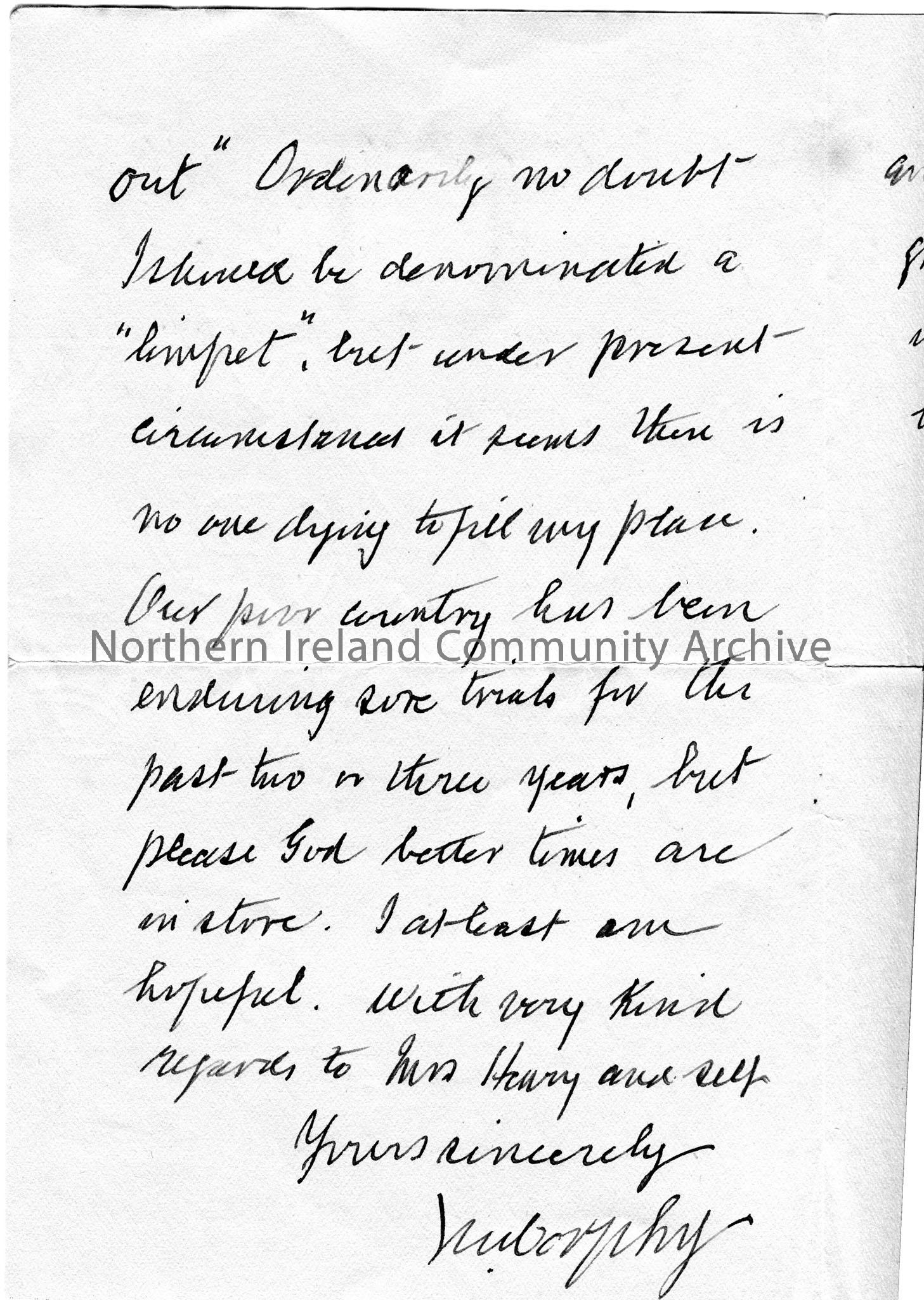 Handwritten letter (on blue paper, folded over, written on 3 sides) to Sam Henry. Congratulates Sam and Mrs Henry on the birth of their daughter [Oliv… – scan141c