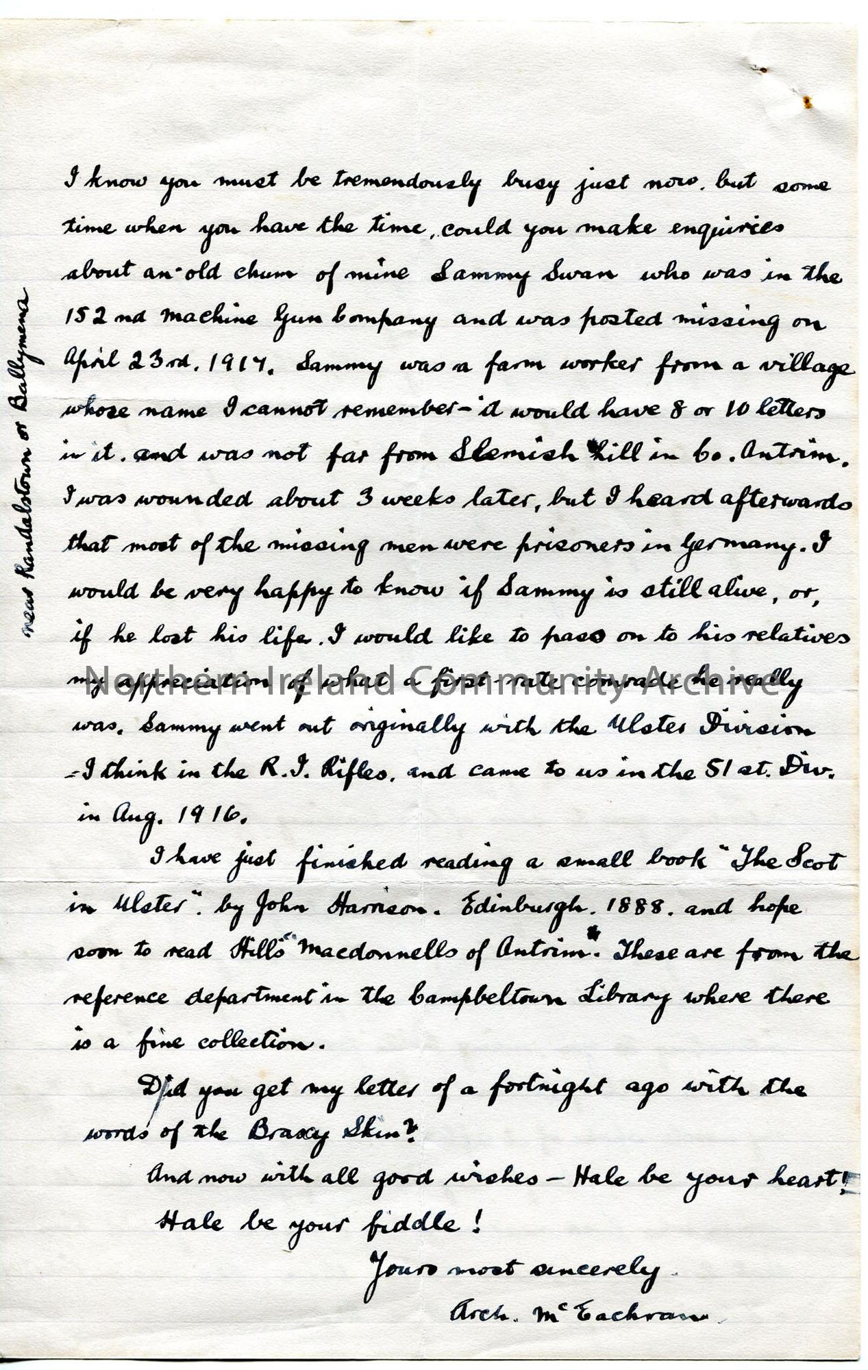Handwritten letter on both sides of page. Congratulates Sam on broadcast - many locals listen. Area would be of interest to Sam due to 'former close associations with the north of Ireland'. Asks about County Antrim friend posted as missing in WWI when Archie was wounded. Has read book 'The Scot in Ulster'