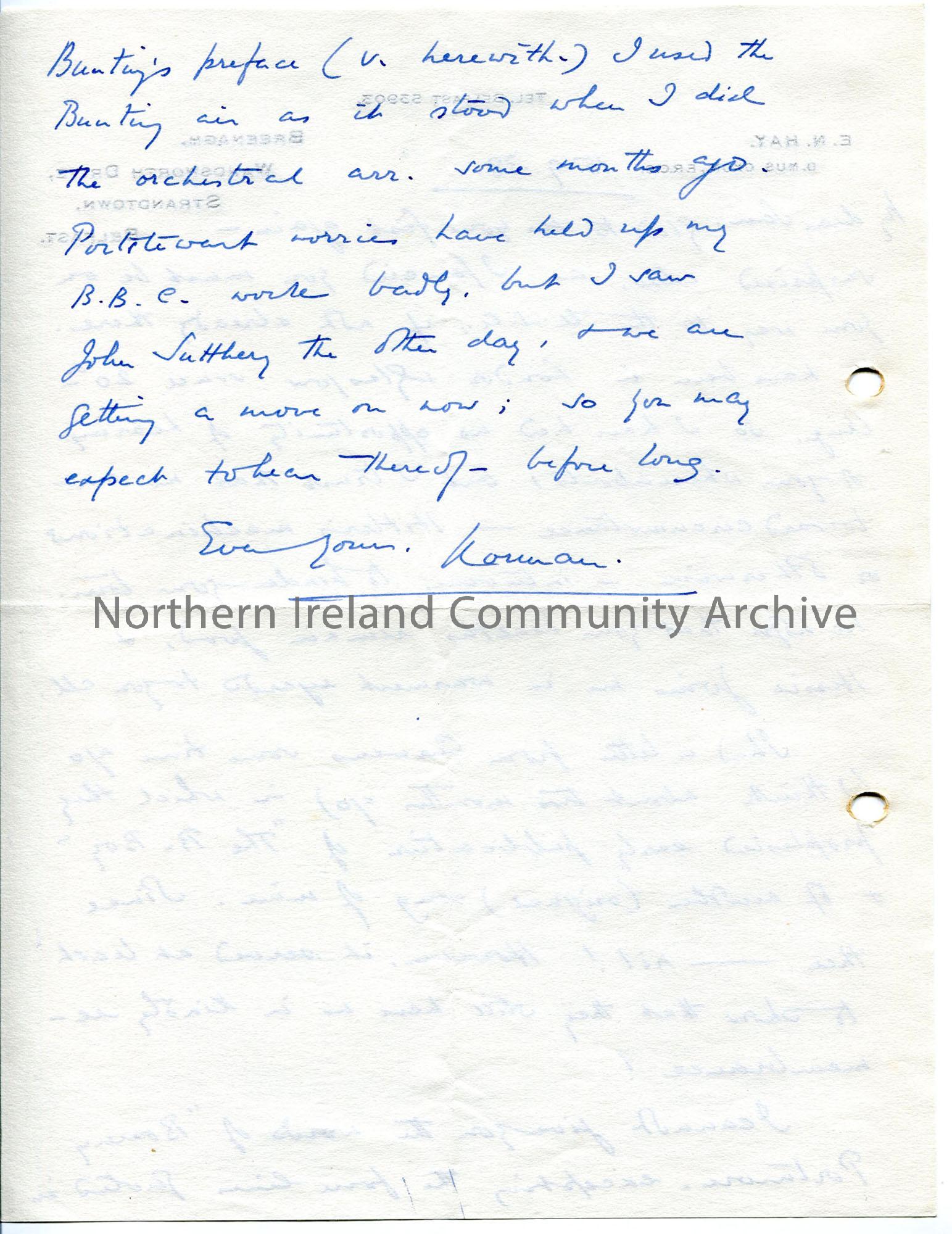 Handwritten letter on both sides of page. Expected Sam to be in USA by now - hopes Hitler or other difficulties have not been reason why not. Speaks of orchestral arrangements, BBC work, unable to give Sam words to song except those in Bunting
