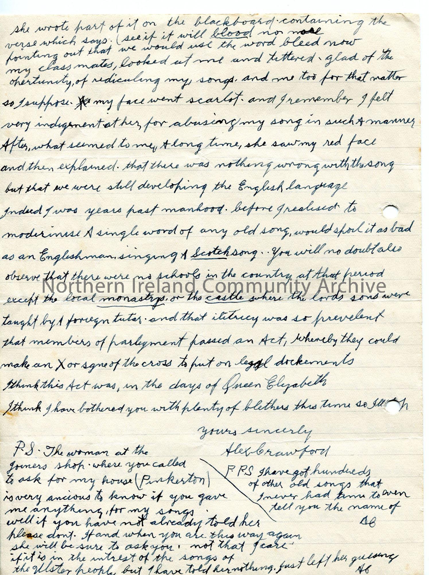 Handwritten letter, on both sides of page. More information re songs. Refers to grammar and spelling of old songs. Tales of school days and learning songs. Uses local dialect - Burns quote.