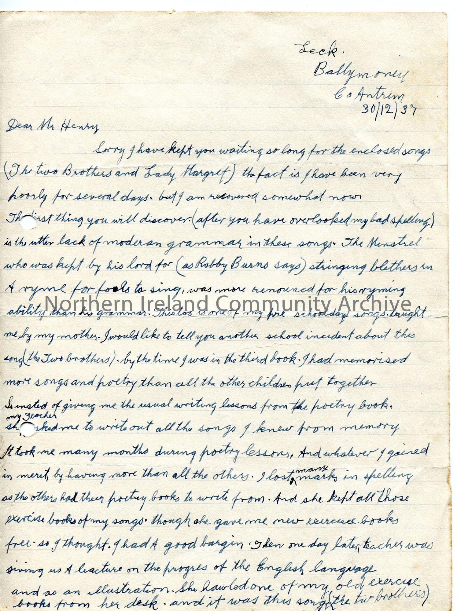 Handwritten letter, on both sides of page. More information re songs. Refers to grammar and spelling of old songs. Tales of school days and learning s…