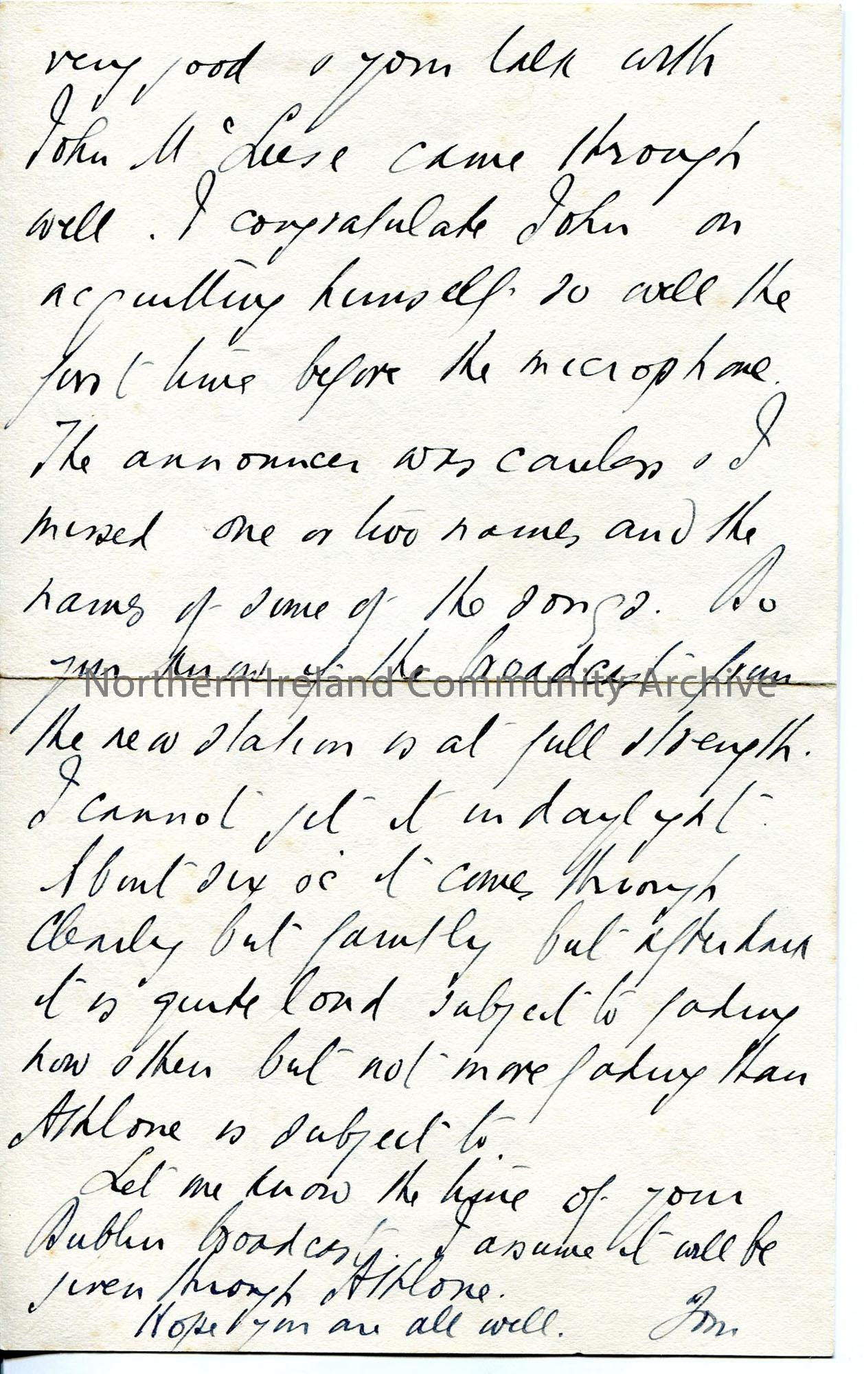 Handwritten letter, on both sides of paper, congratulating Sam on programme broadcast – by date and reference in letter this would be ‘Provincial Jour… – img374