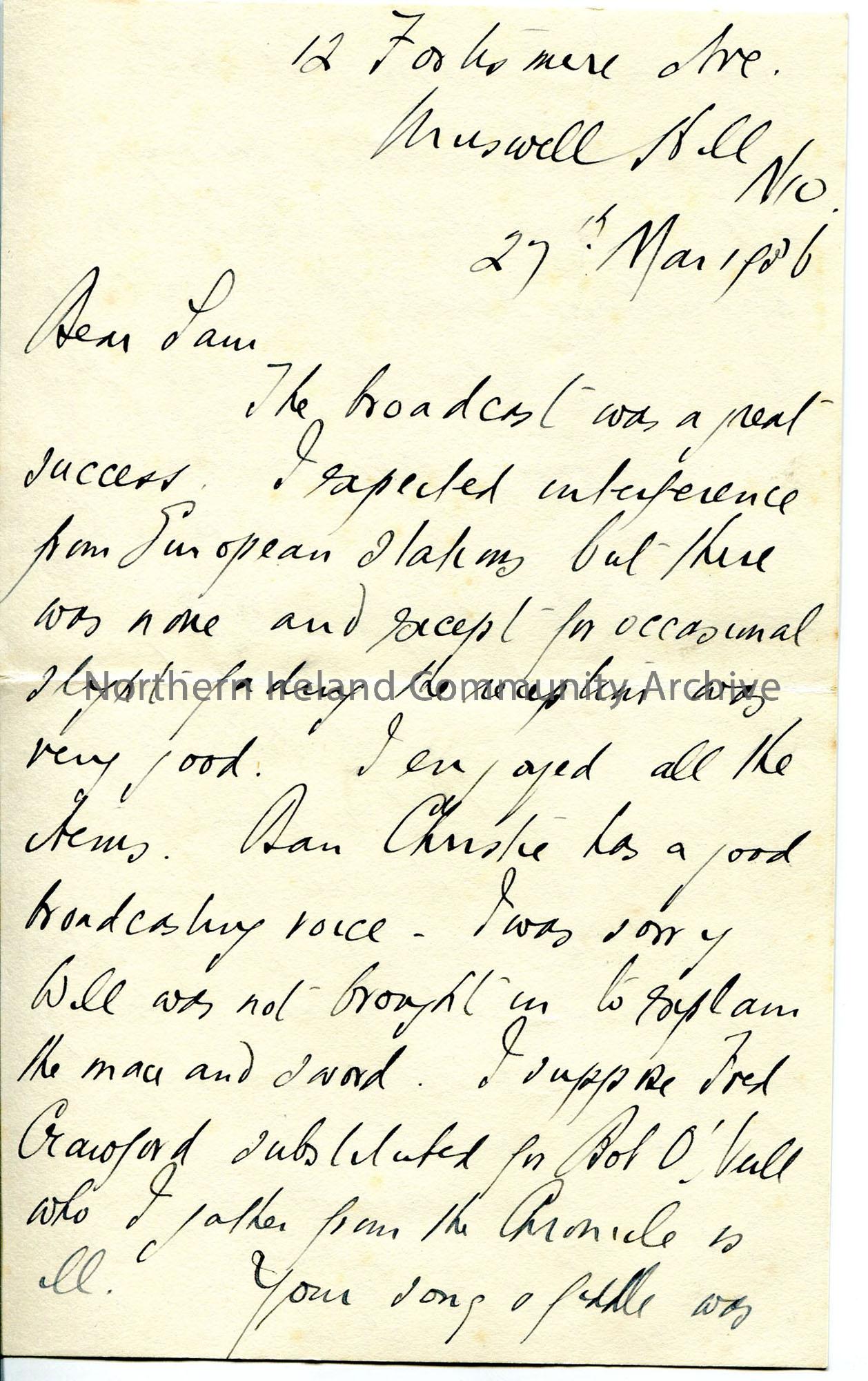 Handwritten letter, on both sides of paper, congratulating Sam on programme broadcast – by date and reference in letter this would be ‘Provincial Jour…