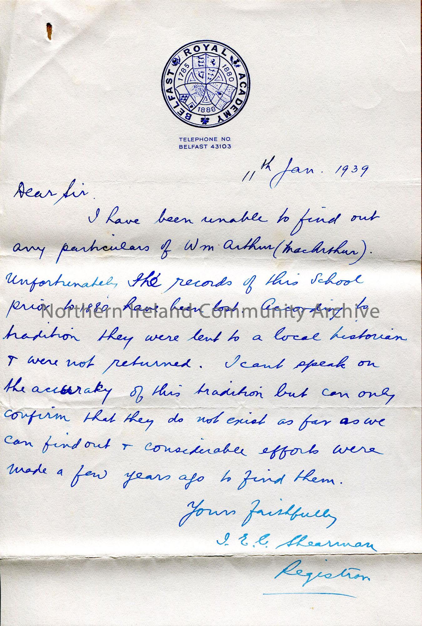handwritten letter on crested notepaper of Belfast Royal Academy. Records prior to 1880 lost so not able to find any information on a William Arthur or McArthur