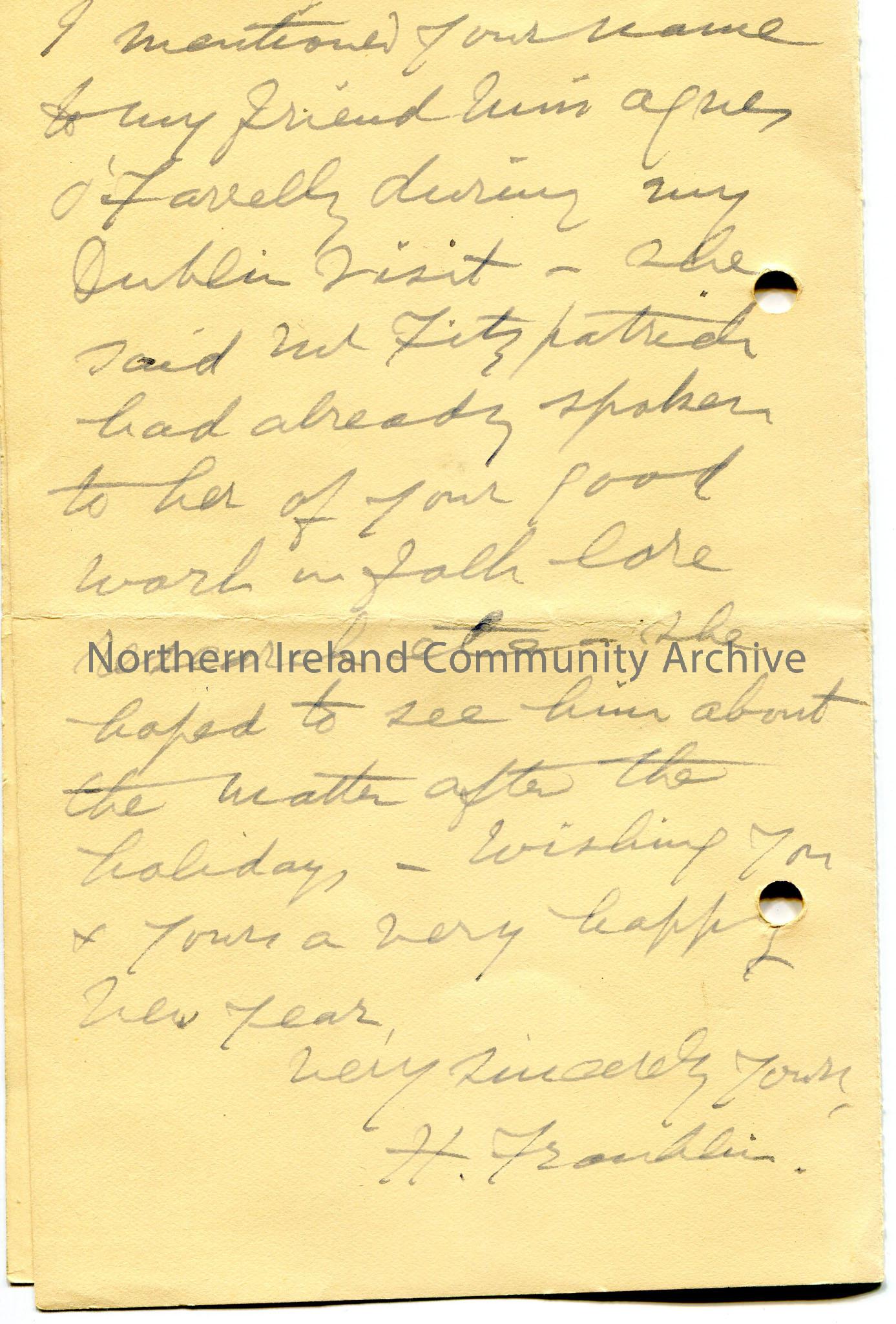 Handwritten letter on folded page, all 4 sides used. To Mr Henry. Asks Sam if he received a copy of the Irish Times which has a part on his paper re Percy French which he read in the Rotary Club on 3rd January. Would like to get a memorial for Percy French at or near the Mountains of Mourne. Suggests a plaque on a garden seat. Mrs French had wrote to him at Christmas time. Enjoyed Sam's Percy French programme on the BBC and suggests joining him in a broadcast either in Belfast or Dublin. Mentioned Sam's name to ? O'Farrelly in Dublin, she hoped to see Mr Fitzpatrick about a matter after the holiday. Gives Happy New Year wishes.