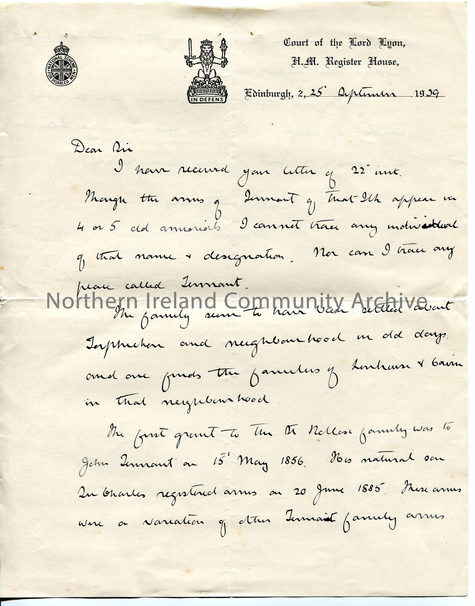 Handwritten letter on headed notepaper of Court of Lord Lyon, re Tennant family information. Some handwritten rough notes on reverse by Sam Henry – Mc…