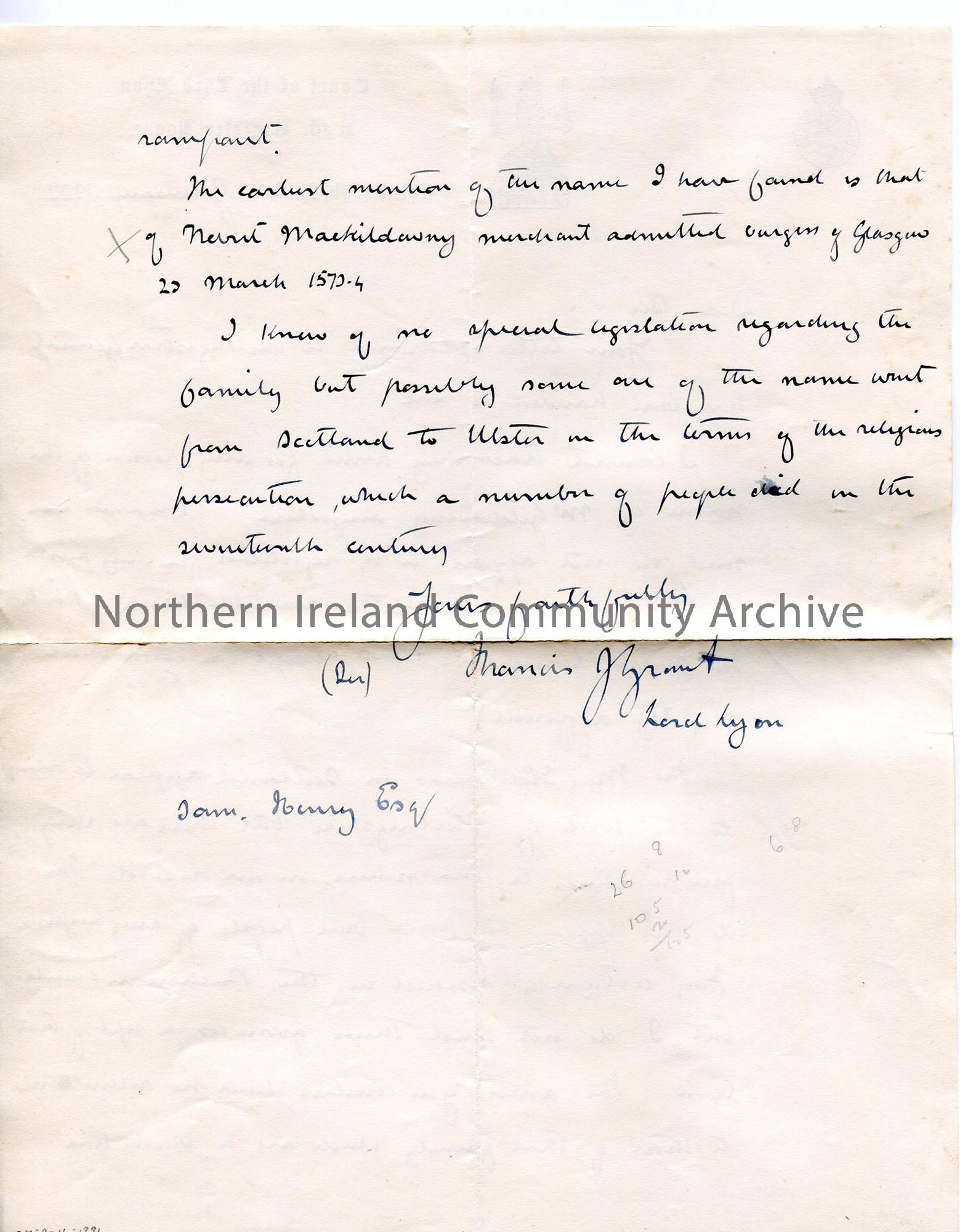 Handwritten letter on headed notepaper of Court of Lord Lyon (see attached) – no trace of any Coat of Arms for McGildowney family. MacIldownies appear… – img994