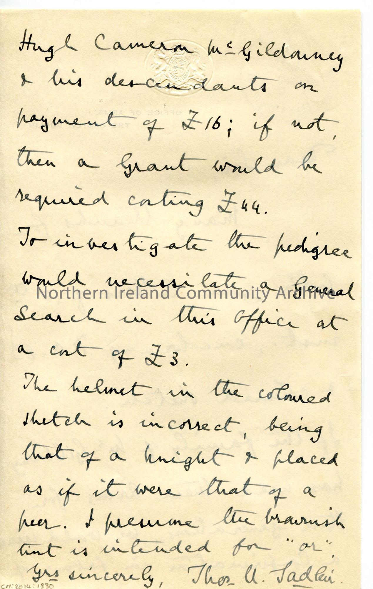 Handwritten letter on headed notepaper of the Office of Arms in Dublin. Gives fees for registering/re-registering McGildowney Coat of Arms, general search fee on family and points out faults in coat of arms as seen on sketch Sam has sent.