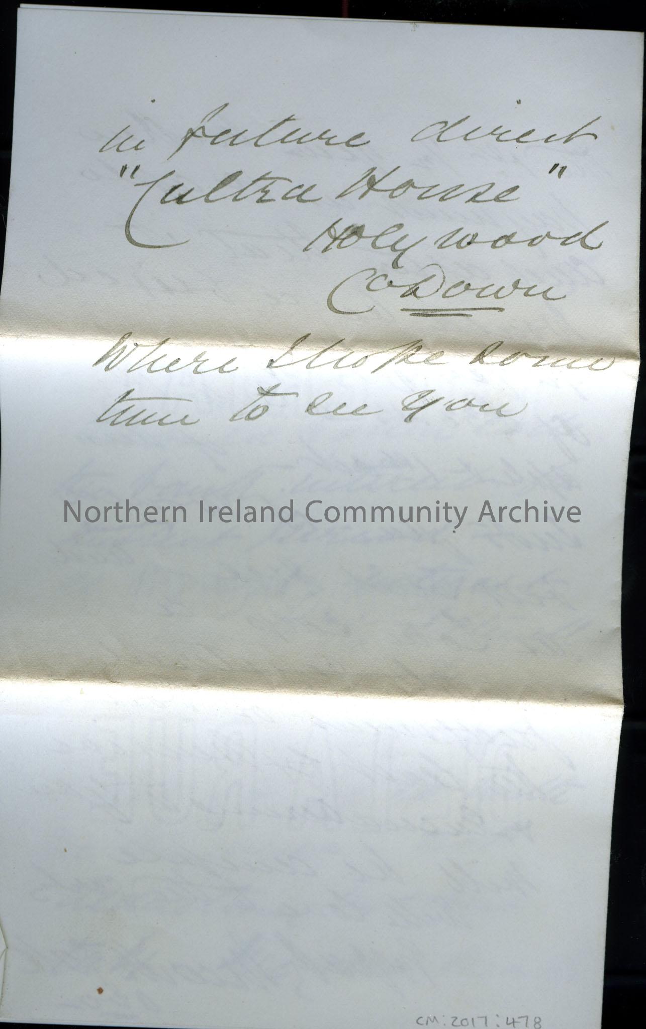 Handwritten letter on headed paper ('The Moat, Strandtown, Belfast'). Addressed to 'my dear John', the letter discusses the transfer of funds for the deposit on a laon, it also details interest rates and repayments for loan/investment. May be from a wife to her husband (John Hezlet?). End of letter requests future correspondence to be addressed to 'Cultra House, Holywood, Co. Down'.