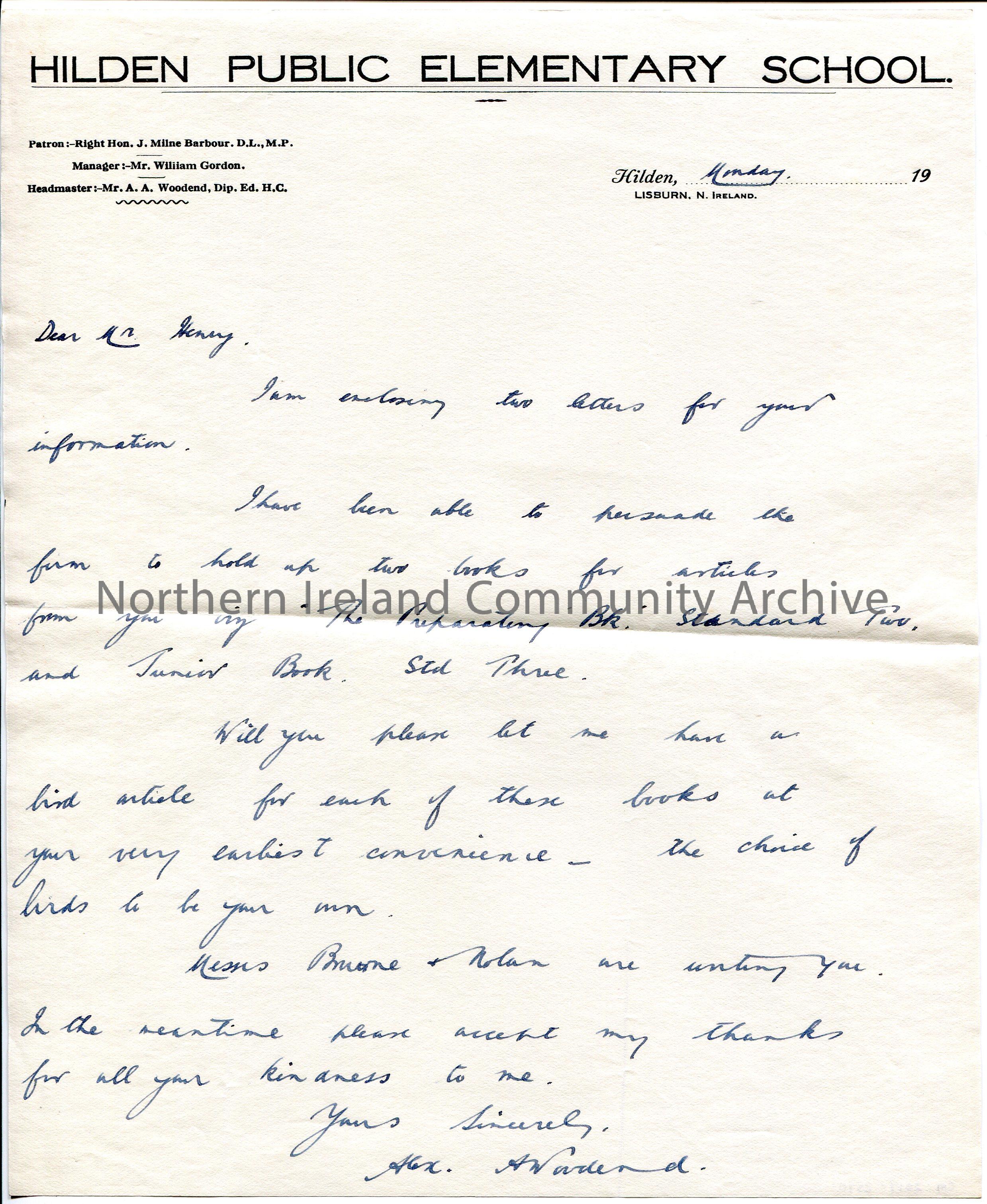 Handwritten letter on headed paper to Mr Henry. Asks Sam to write two articles for two books – ‘The Preparatory Book’ Standard Two and ‘Junior Book’ S…