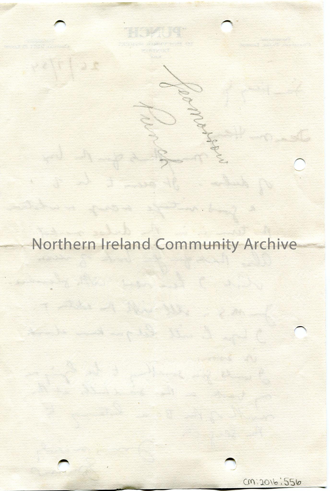 Handwritten letter on headed paper to Sam Henry. Addressed from Punch, 10 Bouverie Street, London. Dated 26th July, 1934. Thanks Sam for sending a box of dulse. Refers to the dulse market. Also thanks Sam for book of verses. Sam to wait to hear re an edition. Refers to lying on the sand hills at the mouth of the Bann listening to seagulls.