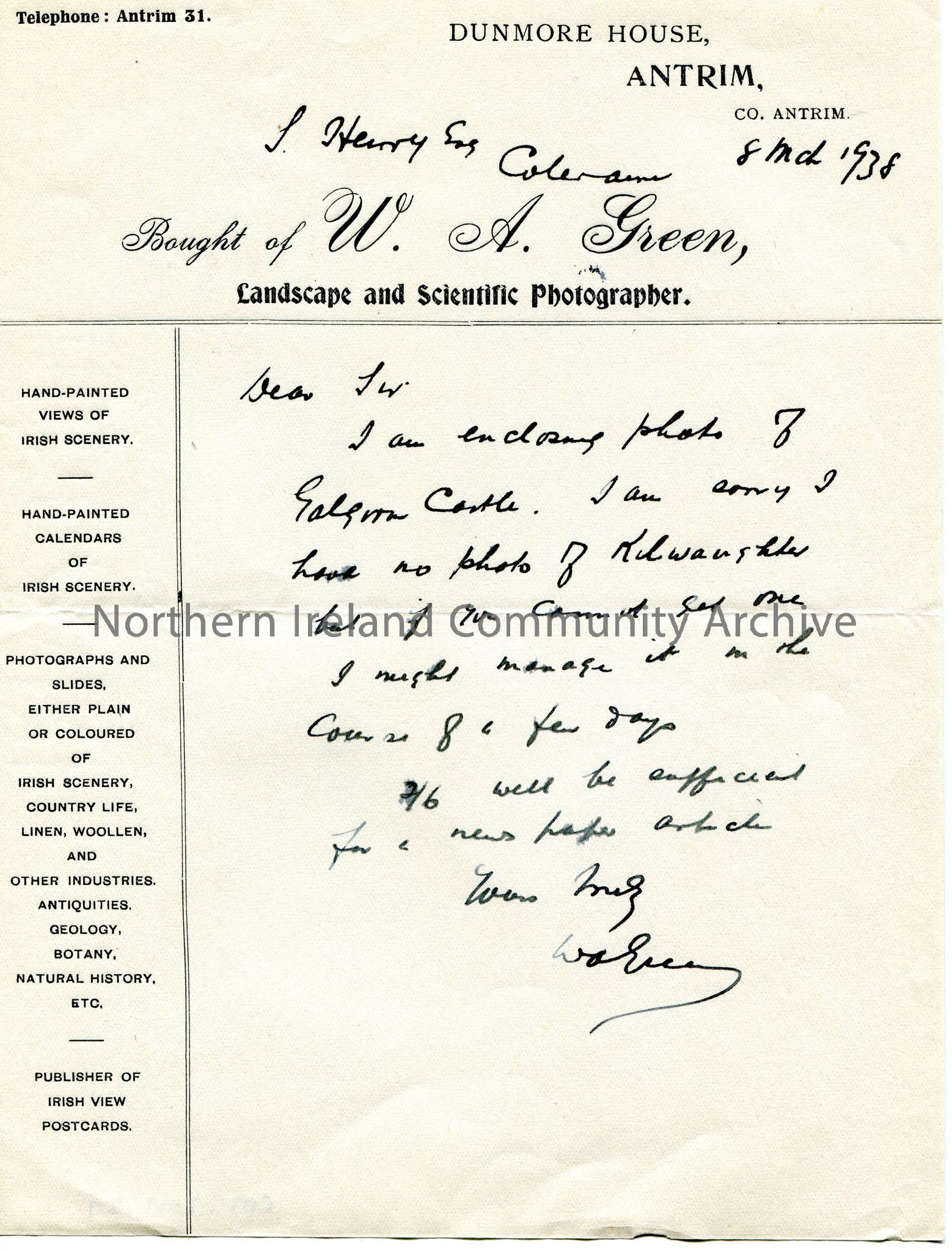 Handwritten letter on headed paper to Sam Henry, Coleraine dated 8th March, 1938. Encloses photograph of Galgorm Castle. Apologises for not having a p…
