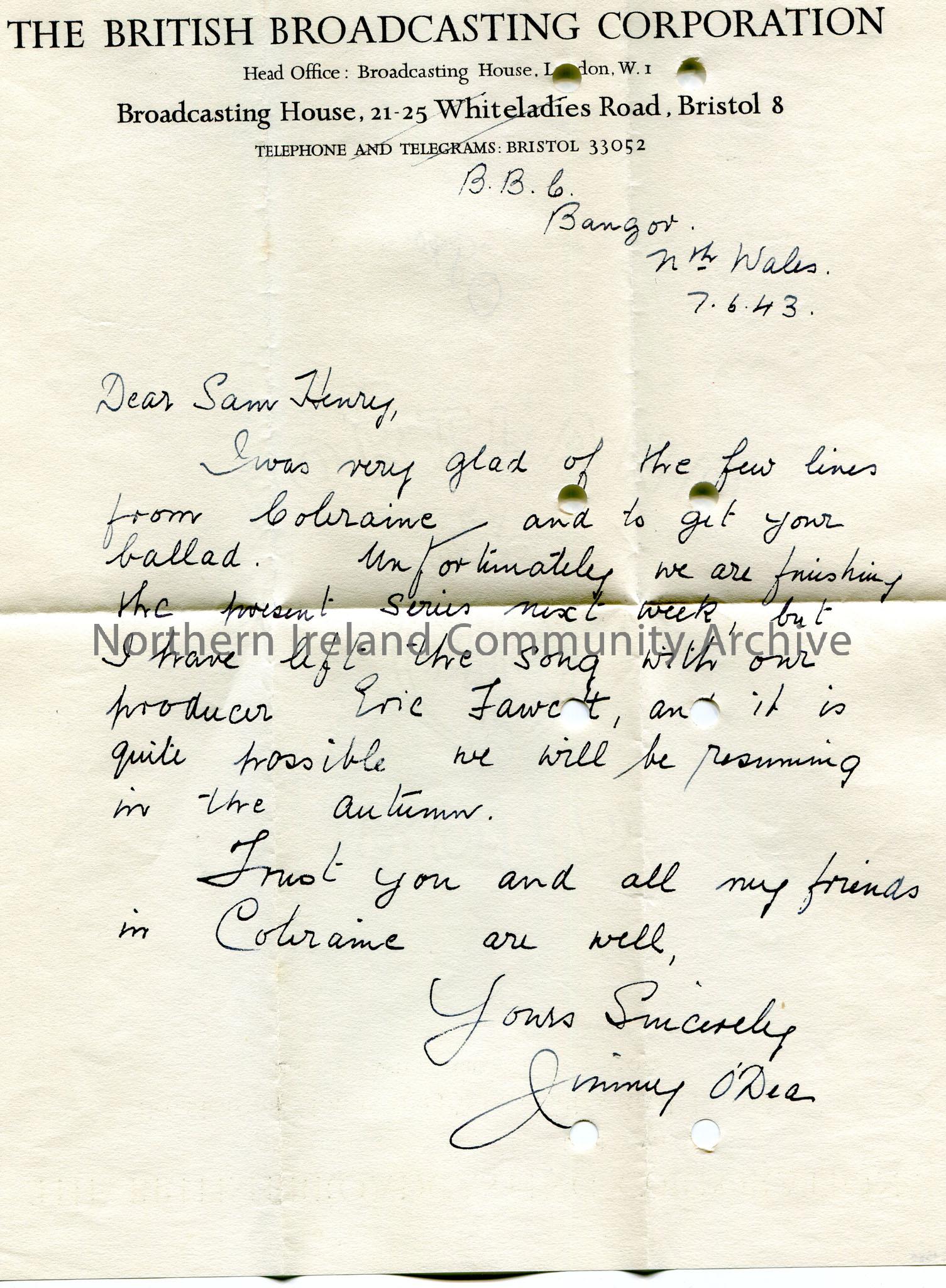 Handwritten letter on headed paper to Sam Henry. Glad to get the ballad sent by Sam. They are not able to get it into a current series but have passed it onto the producer, Eric Fawcett.