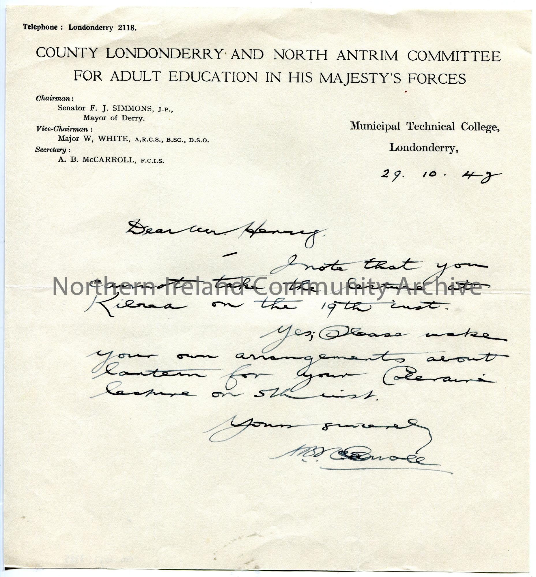 Handwritten letter on headed paper to Sam Henry. Notes that Sam cannot make the lecture at Kilrea on 19th. Sam to make own arrangements re lantern use for lecture on 5th November.
