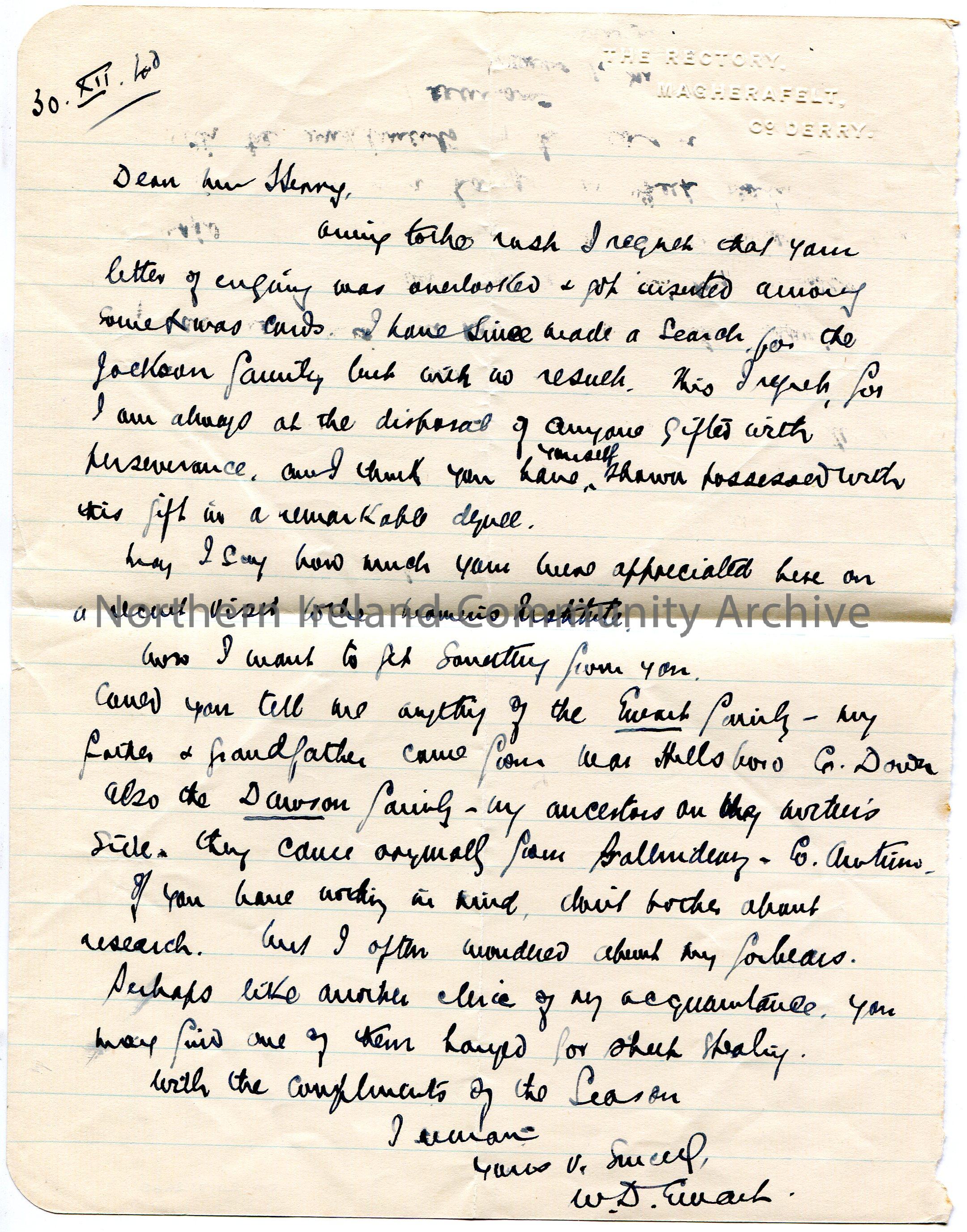 Handwritten letter (on lined paper) to Mr Henry. They were helping Sam with his research re Jackson family but did not find anything. Asks for Sam's help in researching information re the Ewart family. Tells Sam that his visit to the Women's Institute was appreciated.