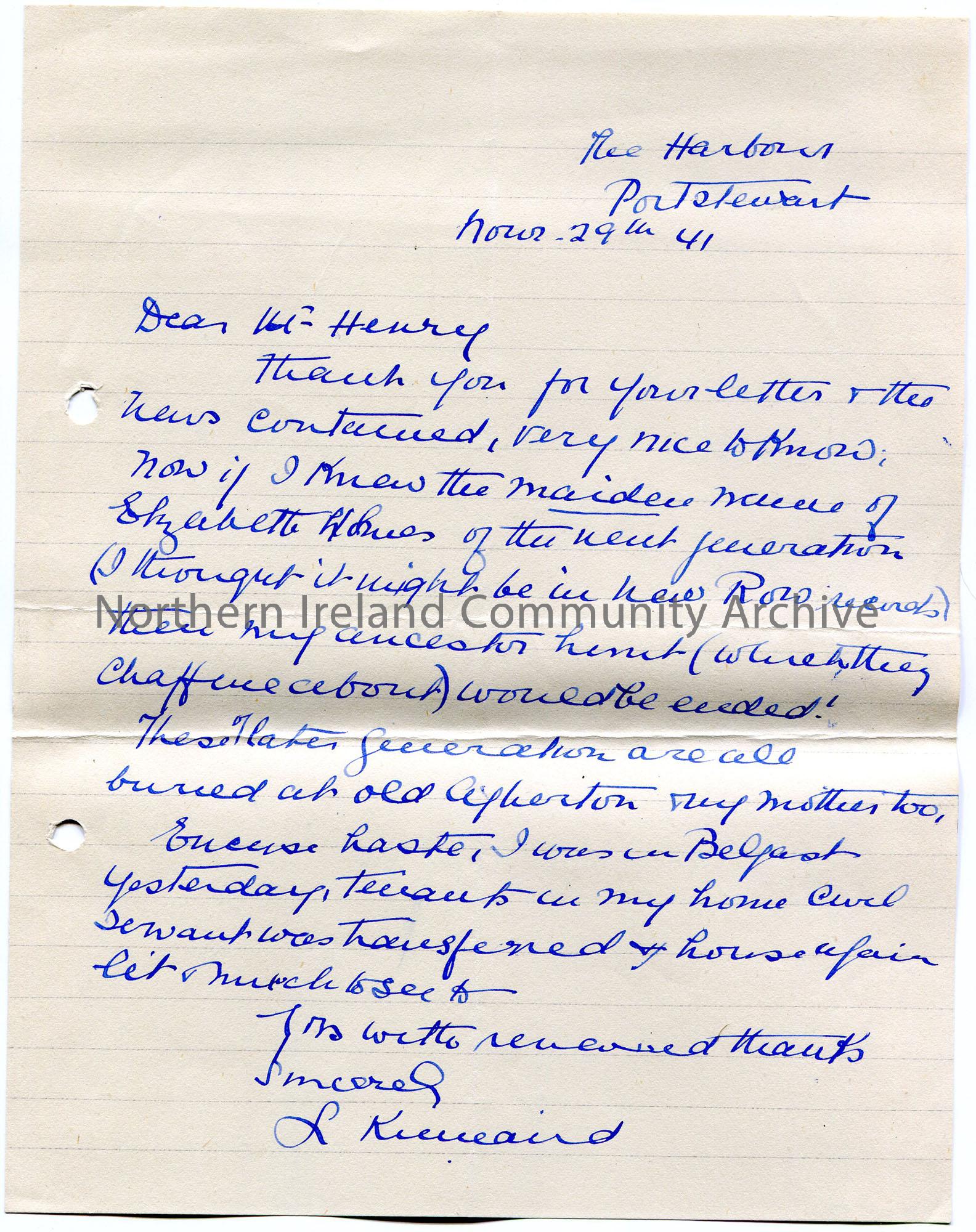 Handwritten letter on lined paper to Mr Henry. Writing re their ancestry - Elizabeth Holmes. They thought her maiden name may have been in New Row records. Writes that the later generation are buried in old Agherton. Writes of going to Belfast to their house and transferring a servant.