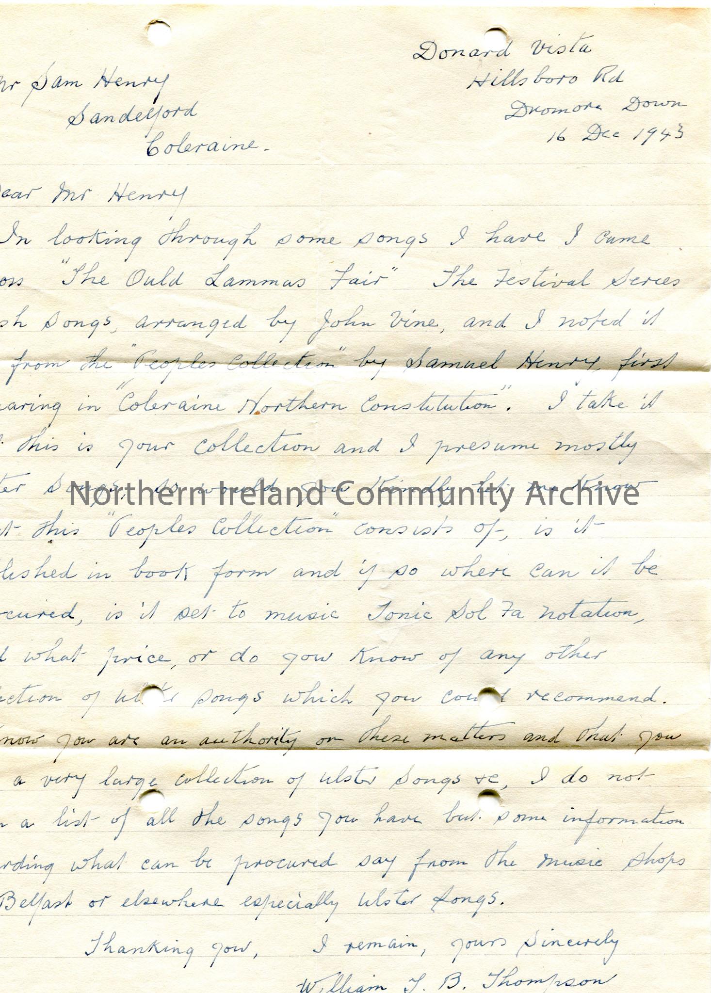 Handwritten letter on lined paper to Sam Henry, Sandelford, Coleraine. 'Songs' written in pencil on back of page. Came across 'The Ould Lammas Fair' in the 'The Festival Series Irish Songs' arranged by John Vine. It was listed as from the 'People's Collection'. He would like to know more about the collection and how to obtain it or any other collection of Ulster Songs. Knows that Sam is 'an authority on these matters'.